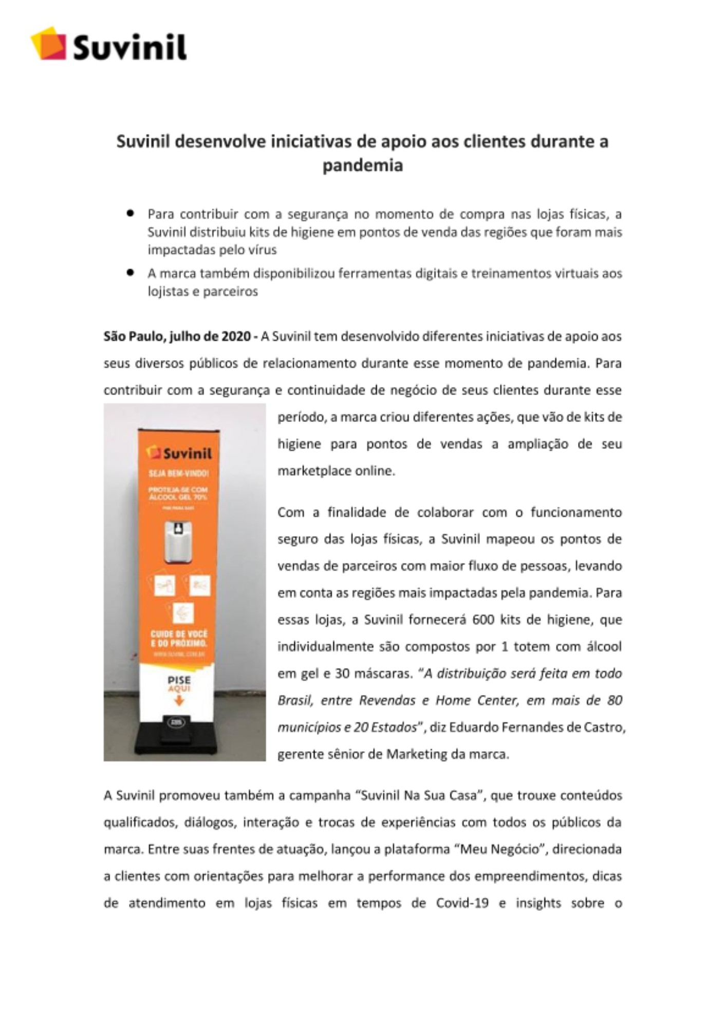 Com a finalidade de colaborar com o funcionamento seguro das lojas físicas, a Suvinil mapeou os pontos de vendas de parceiros com maior fluxo de pessoas, levando em conta as regiões mais impactadas pela pandemia. Para essas lojas, a Suvinil fornecerá 600 kits de higiene, que individualmente são compostos por 1 totem com álcool em gel e 30 máscaras. “A distribuição será feita em todo Brasil, entre Revendas e Home Center, em mais de 80 municípios e 20 Estados”, diz Eduardo Fernandes de Castro, gerente sênior de Marketing da marca.