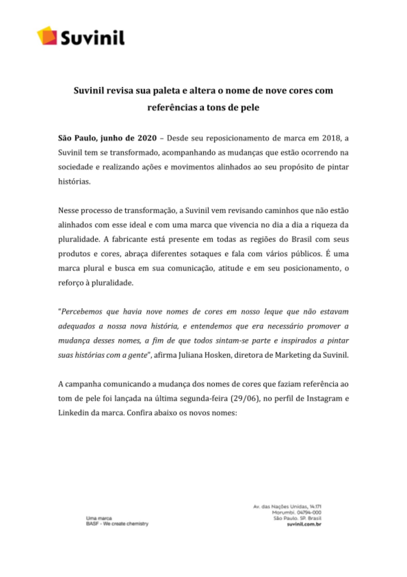 A campanha comunicando a mudança dos nomes de cores que faziam referência ao tom de pele foi lançada na última segunda-feira (29/06), no perfil de Instagram e Linkedin da marca.