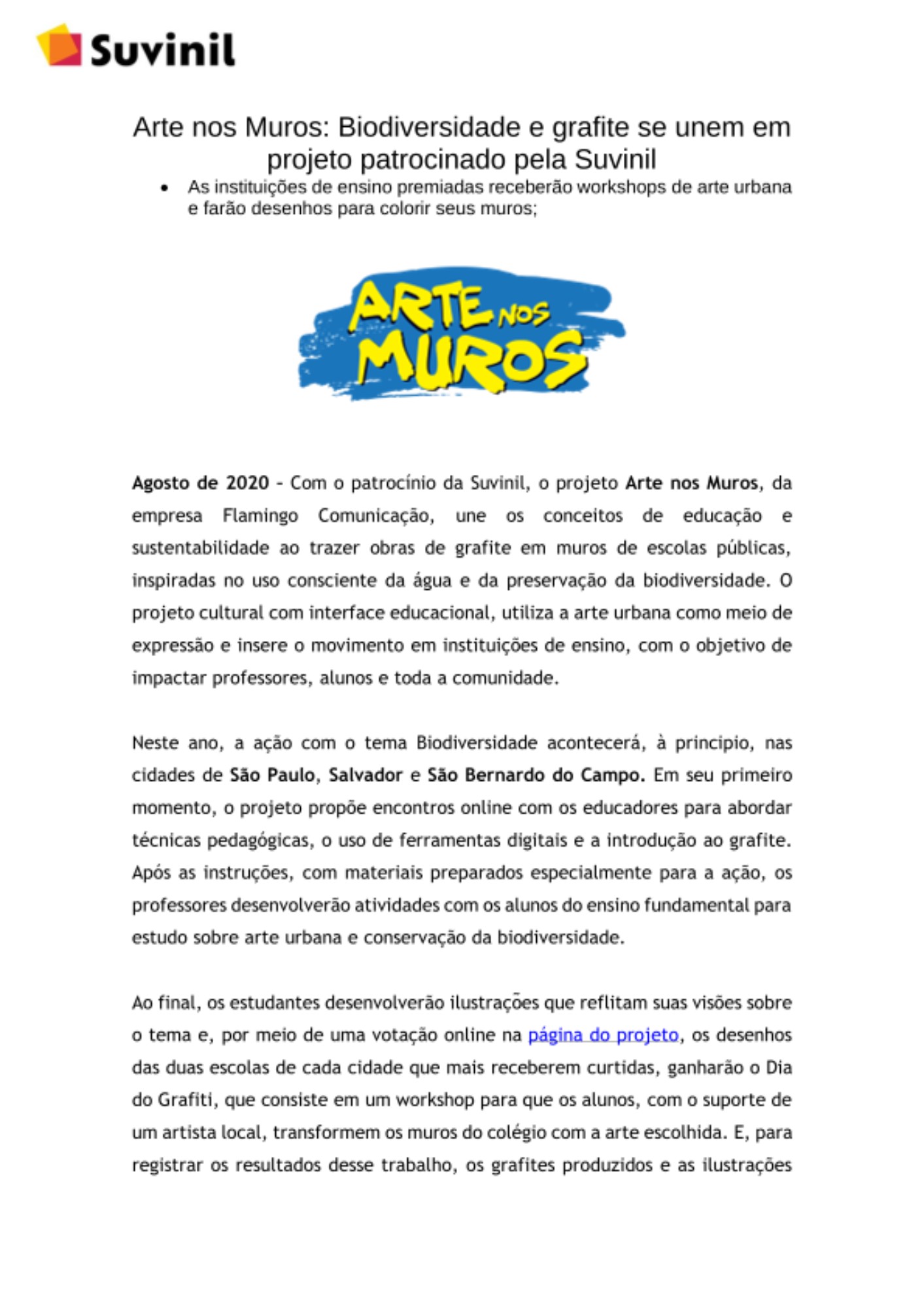 Com o patrocínio da Suvinil, o projeto Arte nos Muros, da empresa Flamingo Comunicação, une os conceitos de educação e sustentabilidade ao trazer obras de grafite em muros de escolas públicas, inspiradas no uso consciente da água e da preservação da biodiversidade. O projeto cultural com interface educacional, utiliza a arte urbana como meio de expressão e insere o movimento em instituições de ensino, com o objetivo de impactar professores, alunos e toda a comunidade.