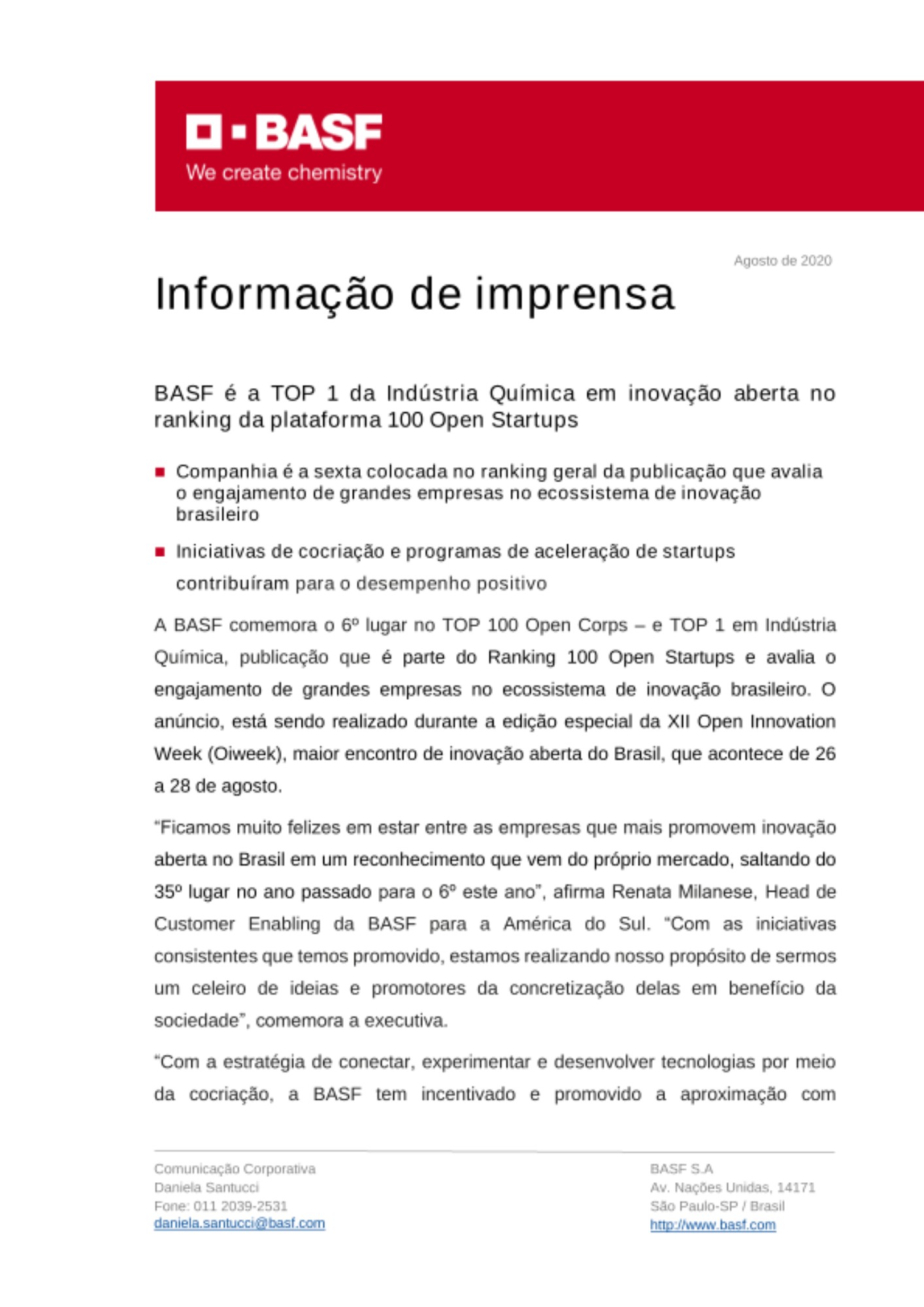 A BASF comemora o 6º lugar no TOP 100 Open Corps – e TOP 1 em Indústria Química, publicação que é parte do Ranking 100 Open Startups e avalia o engajamento de grandes empresas no ecossistema de inovação brasileiro. O anúncio, está sendo realizado durante a edição especial da XII Open Innovation Week (Oiweek), maior encontro de inovação aberta do Brasil, que acontece de 26 a 28 de agosto.