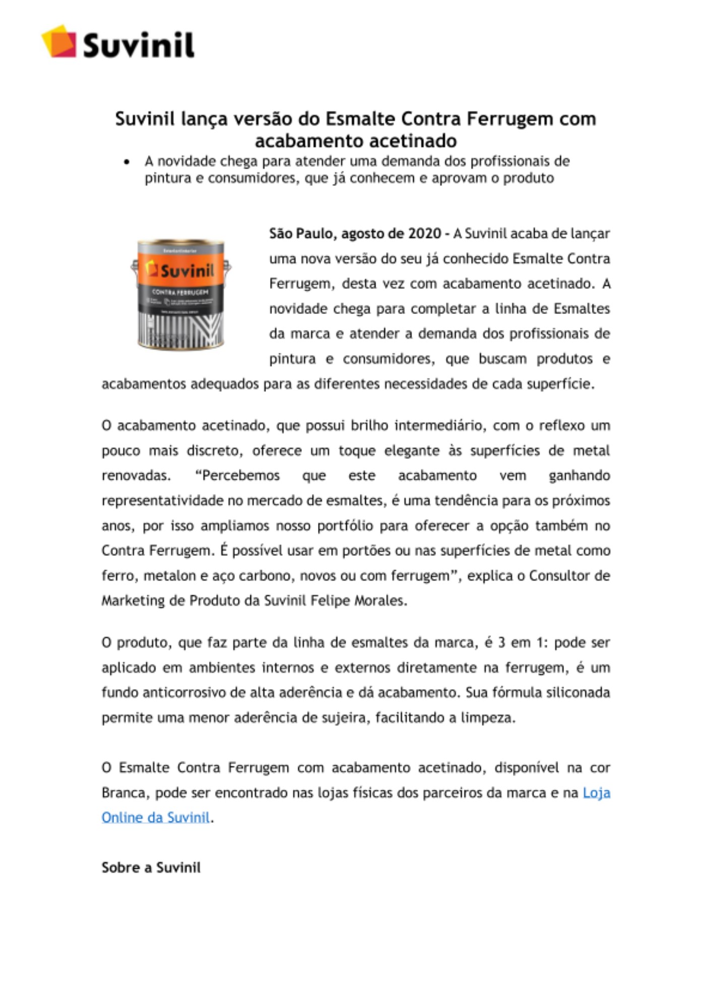 O acabamento acetinado, que possui brilho intermediário, com o reflexo um pouco mais discreto, oferece um toque elegante às superfícies de metal renovadas. “Percebemos que este acabamento vem ganhando representatividade no mercado de esmaltes, é uma tendência para os próximos anos, por isso ampliamos nosso portfólio para oferecer a opção também no Contra Ferrugem. É possível usar em portões ou nas superfícies de metal como ferro, metalon e aço carbono, novos ou com ferrugem”, explica o Consultor de Marketing de Produto da Suvinil Felipe Morales.