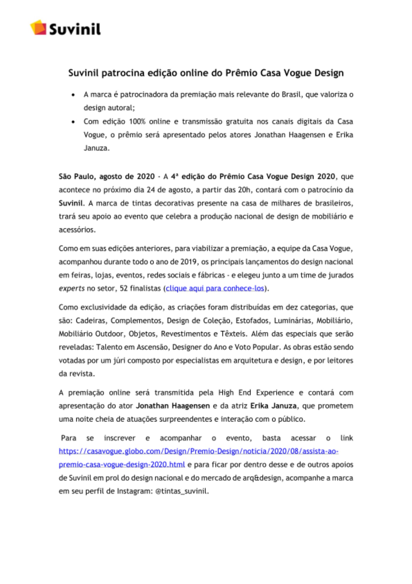 https://casavogue.globo.com/Design/Premio-Design/noticia/2020/08/assista-ao- premio-casa-vogue-design-2020.html e para ficar por dentro desse e de outros apoios de Suvinil em prol do design nacional e do mercado de arq&design, acompanhe a marca em seu perfil de Instagram: @tintas_suvinil.