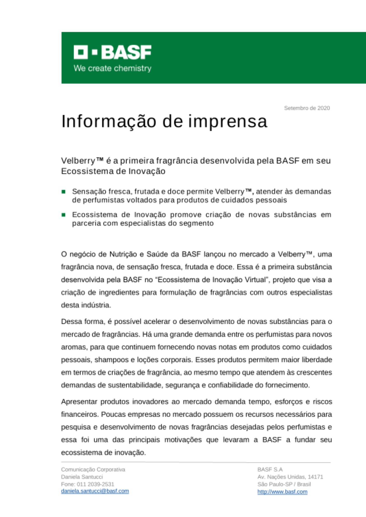 O negócio de Nutrição e Saúde da BASF lançou no mercado a Velberry™, uma fragrância nova, de sensação fresca, frutada e doce. Essa é a primeira substância desenvolvida pela BASF no “Ecossistema de Inovação Virtual”, projeto que visa a criação de ingredientes para formulação de fragrâncias com outros especialistas desta indústria.