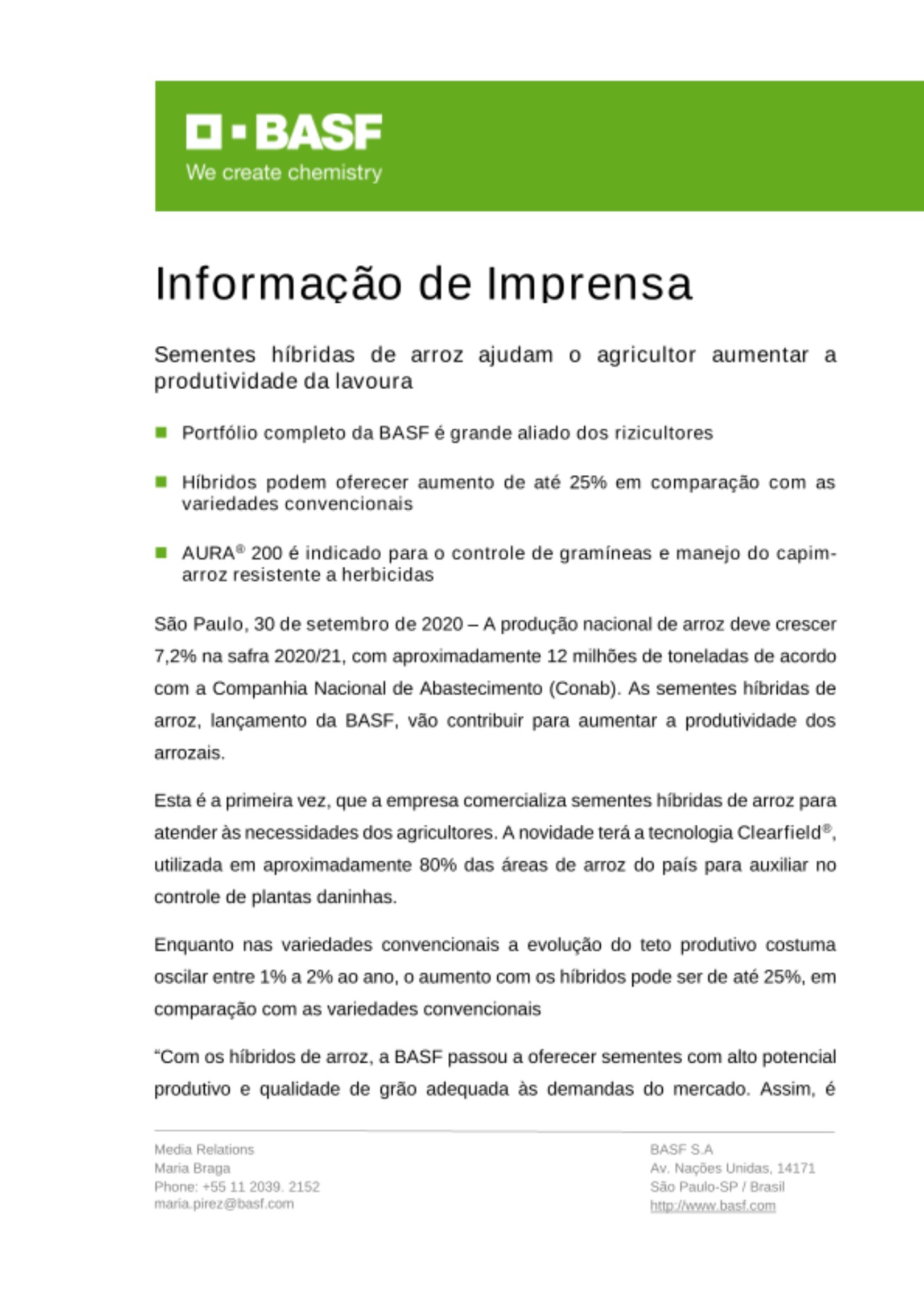 São Paulo, 30 de setembro de 2020 – A produção nacional de arroz deve crescer 7,2% na safra 2020/21, com aproximadamente 12 milhões de toneladas de acordo com a Companhia Nacional de Abastecimento (Conab). As sementes híbridas de arroz, lançamento da BASF, vão contribuir para aumentar a produtividade dos arrozais.