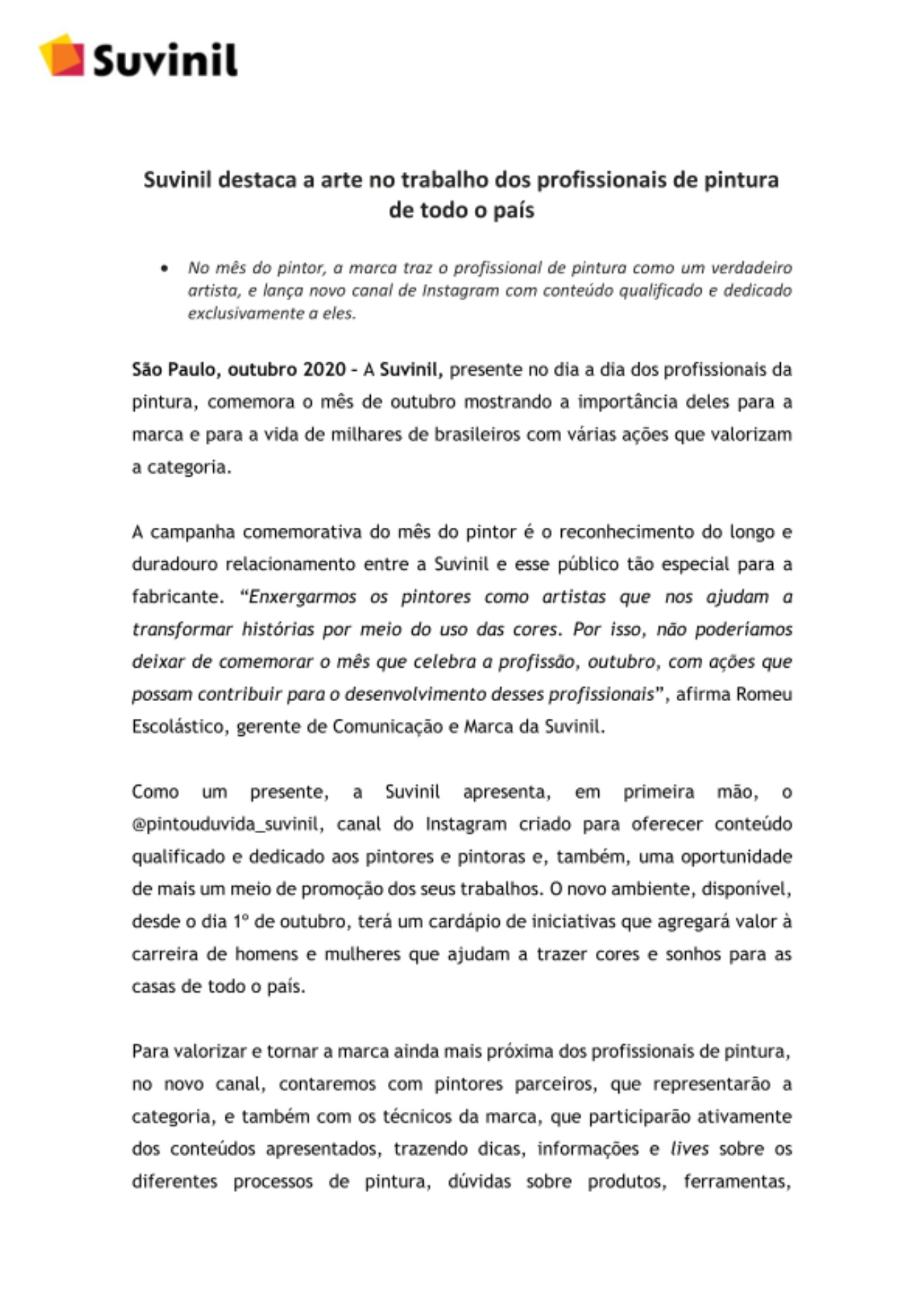 A campanha comemorativa do mês do pintor é o reconhecimento do longo e duradouro relacionamento entre a Suvinil e esse público tão especial para a fabricante. “Enxergarmos os pintores como artistas que nos ajudam a transformar histórias por meio do uso das cores. Por isso, não poderíamos deixar de comemorar o mês que celebra a profissão, outubro, com ações que possam contribuir para o desenvolvimento desses profissionais”, afirma Romeu Escolástico, gerente de Comunicação e Marca da Suvinil.