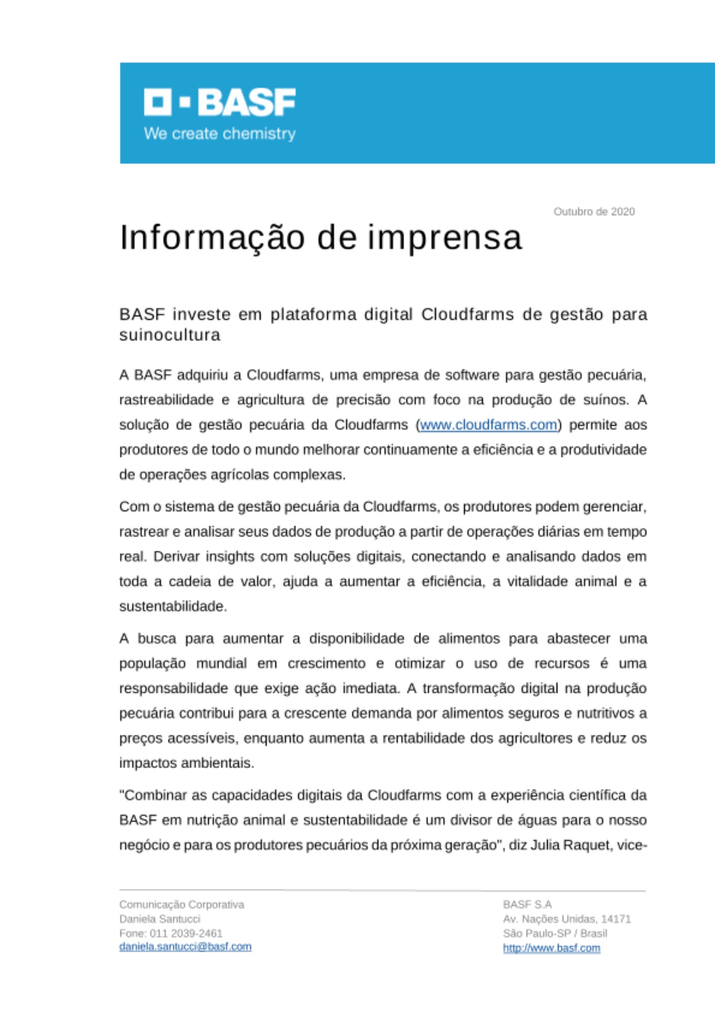"Combinar as capacidades digitais da Cloudfarms com a experiência científica da BASF em nutrição animal e sustentabilidade é um divisor de águas para o nosso negócio e para os produtores pecuários da próxima geração", diz Julia Raquet, vice-presidente sênior da BASF Nutrição Animal e Ingredientes Aromatizantes. "Com esta aquisição, reforçamos o nosso compromisso de enfrentar o desafio global de um sistema alimentar sustentável para a população mundial em crescimento, possibilitado pelas tecnologias digitais", considera.