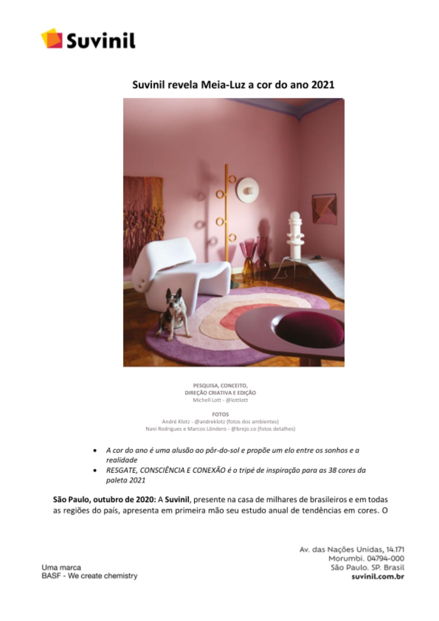 A Suvinil, presente na casa de milhares de brasileiros e em todas as regiões do país, apresenta em primeira mão seu estudo anual de tendências em cores. O Suvinil Revela 2021, assinado por Michell Lott, jornalista, diretor criativo e consultor de cores da marca, convida todos para vivenciar uma imersão alinhada ao momento atual e às perspectivas para o próximo ano, essa temporada de ressignificação que invadiu não apenas o Brasil, mas o mundo. Com um mergulho intenso ditado pelo distanciamento social e, com ele, uma montanha-russa de sentimentos que passaram a fazer parte do cotidiano das pessoas, o novo estudo de tendências da Suvinil é marcado pela transformação que invadiu as sensações e emoções individuais e, também, o jeito de morar e vivenciar a Casa, revelando “Meia-Luz” como a cor do ano 2021, além das paletas batizadas com os temas: RESGATE, CONSCIÊNCIA e CONEXÃO.