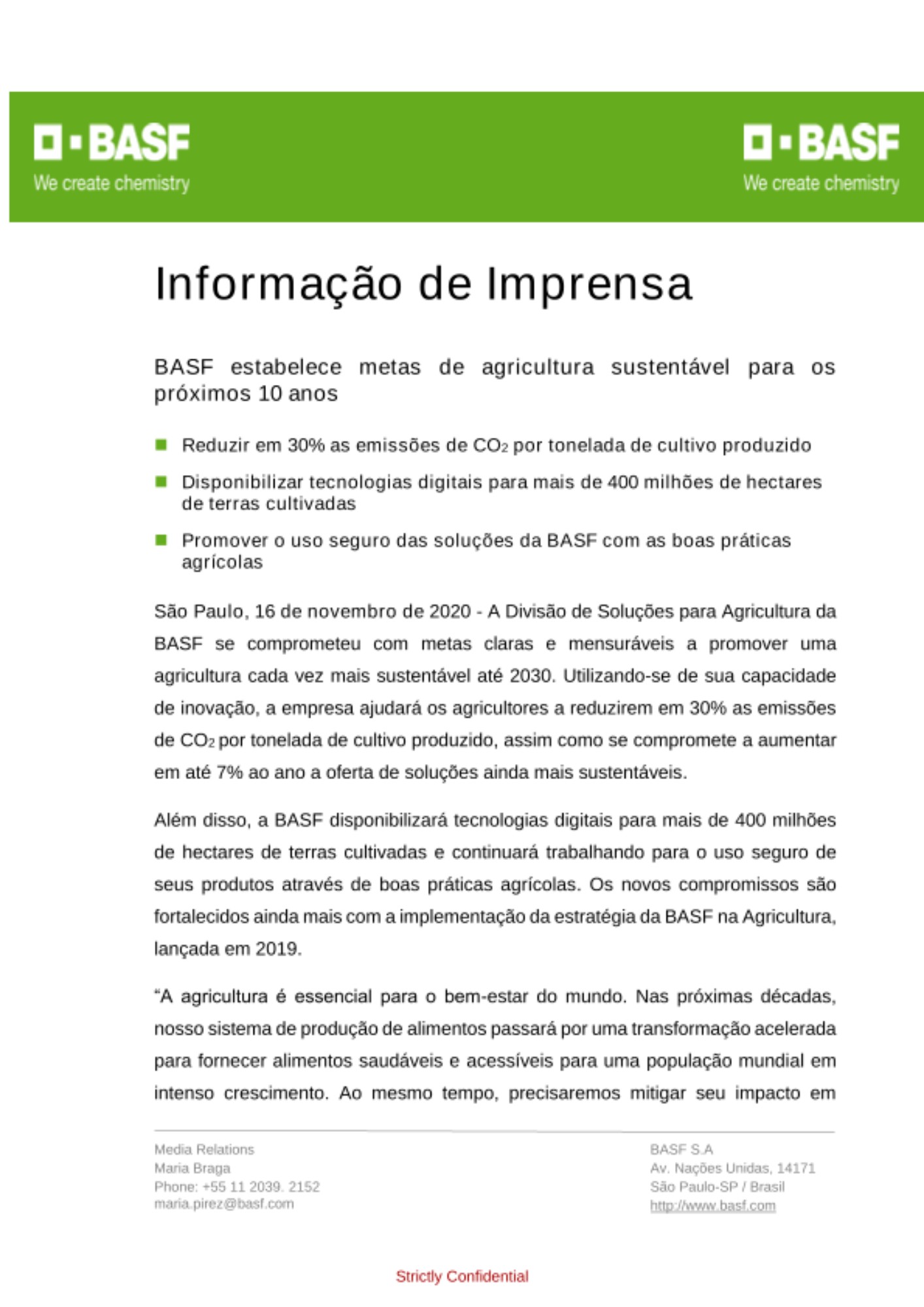 Além disso, a BASF disponibilizará tecnologias digitais para mais de 400 milhões de hectares de terras cultivadas e continuará trabalhando para o uso seguro de seus produtos através de boas práticas agrícolas. Os novos compromissos são fortalecidos ainda mais com a implementação da estratégia da BASF na Agricultura, lançada em 2019.