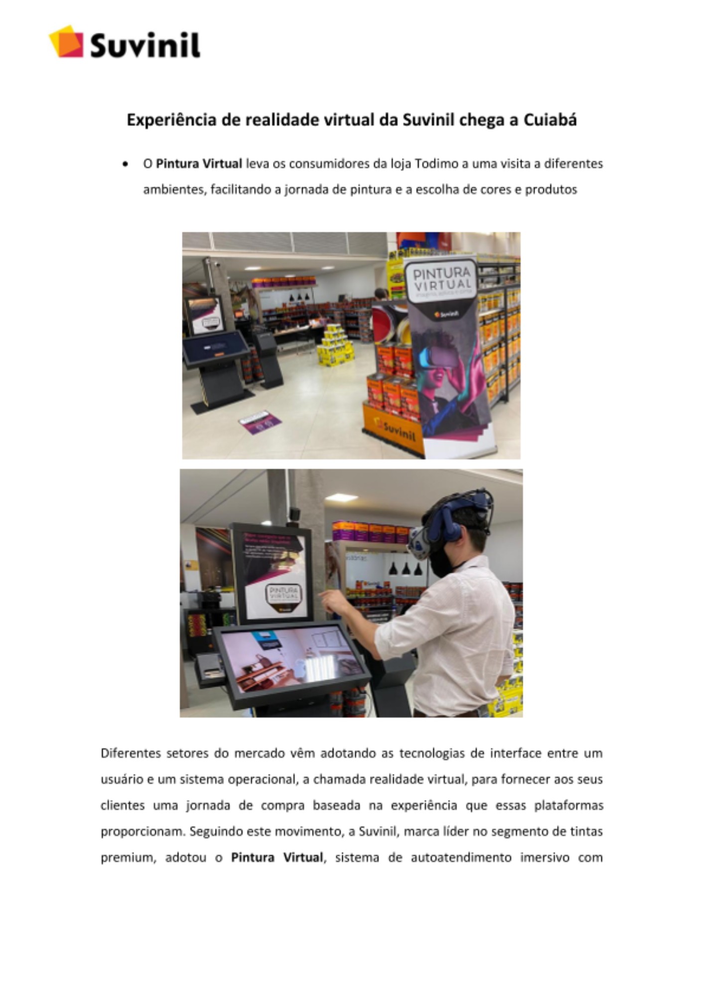 Diferentes setores do mercado vêm adotando as tecnologias de interface entre um usuário e um sistema operacional, a chamada realidade virtual, para fornecer aos seus clientes uma jornada de compra baseada na experiência que essas plataformas proporcionam. Seguindo este movimento, a Suvinil, marca líder no segmento de tintas premium, adotou o Pintura Virtual, sistema de autoatendimento imersivo com navegação por realidade virtual, que chega agora em Cuiabá, na loja Todimo, da Avenida Carmindo de Campos, e estará disponível até o dia 27 de novembro.