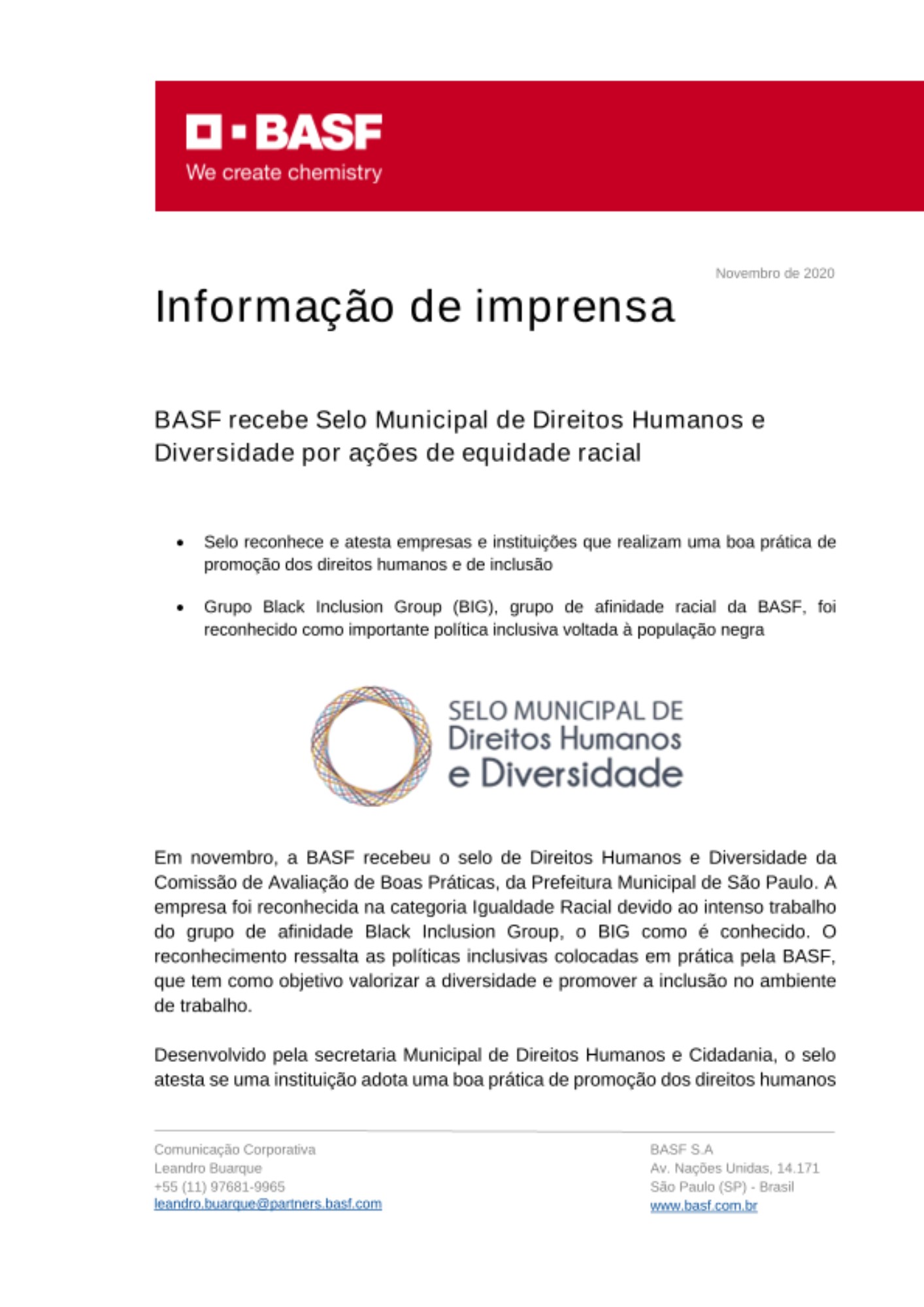 Em novembro, a BASF recebeu o selo de Direitos Humanos e Diversidade da Comissão de Avaliação de Boas Práticas, da Prefeitura Municipal de São Paulo. A empresa foi reconhecida na categoria Igualdade Racial devido ao intenso trabalho do grupo de afinidade Black Inclusion Group, o BIG como é conhecido. O reconhecimento ressalta as políticas inclusivas colocadas em prática pela BASF, que tem como objetivo valorizar a diversidade e promover a inclusão no ambiente de trabalho.