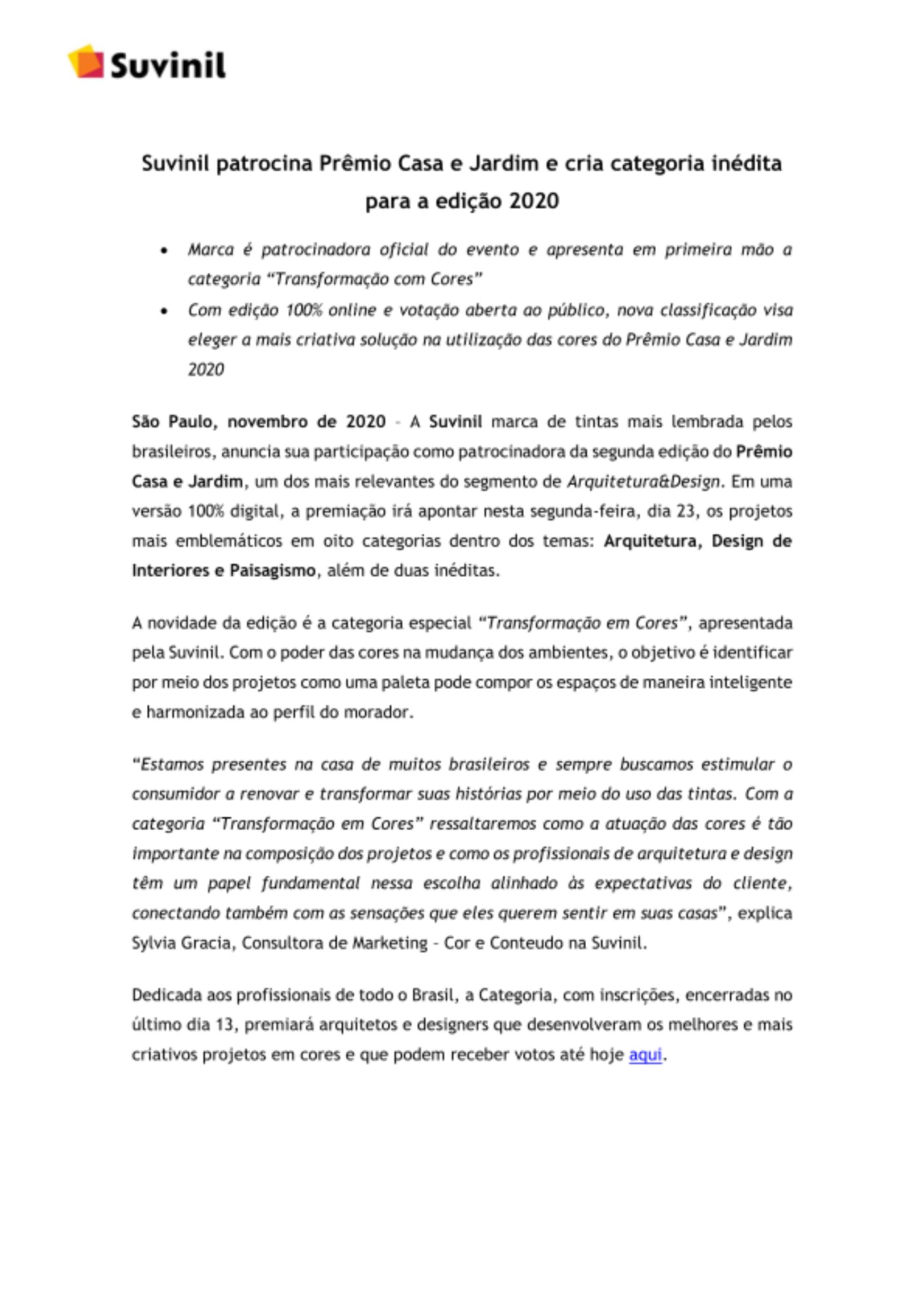 A Suvinil marca de tintas mais lembrada pelos brasileiros, anuncia sua participação como patrocinadora da segunda edição do Prêmio Casa e Jardim, um dos mais relevantes do segmento de Arquitetura&Design. Em uma versão 100% digital, a premiação irá apontar nesta segunda-feira, dia 23, os projetos mais emblemáticos em oito categorias dentro dos temas: Arquitetura, Design de Interiores e Paisagismo, além de duas inéditas.