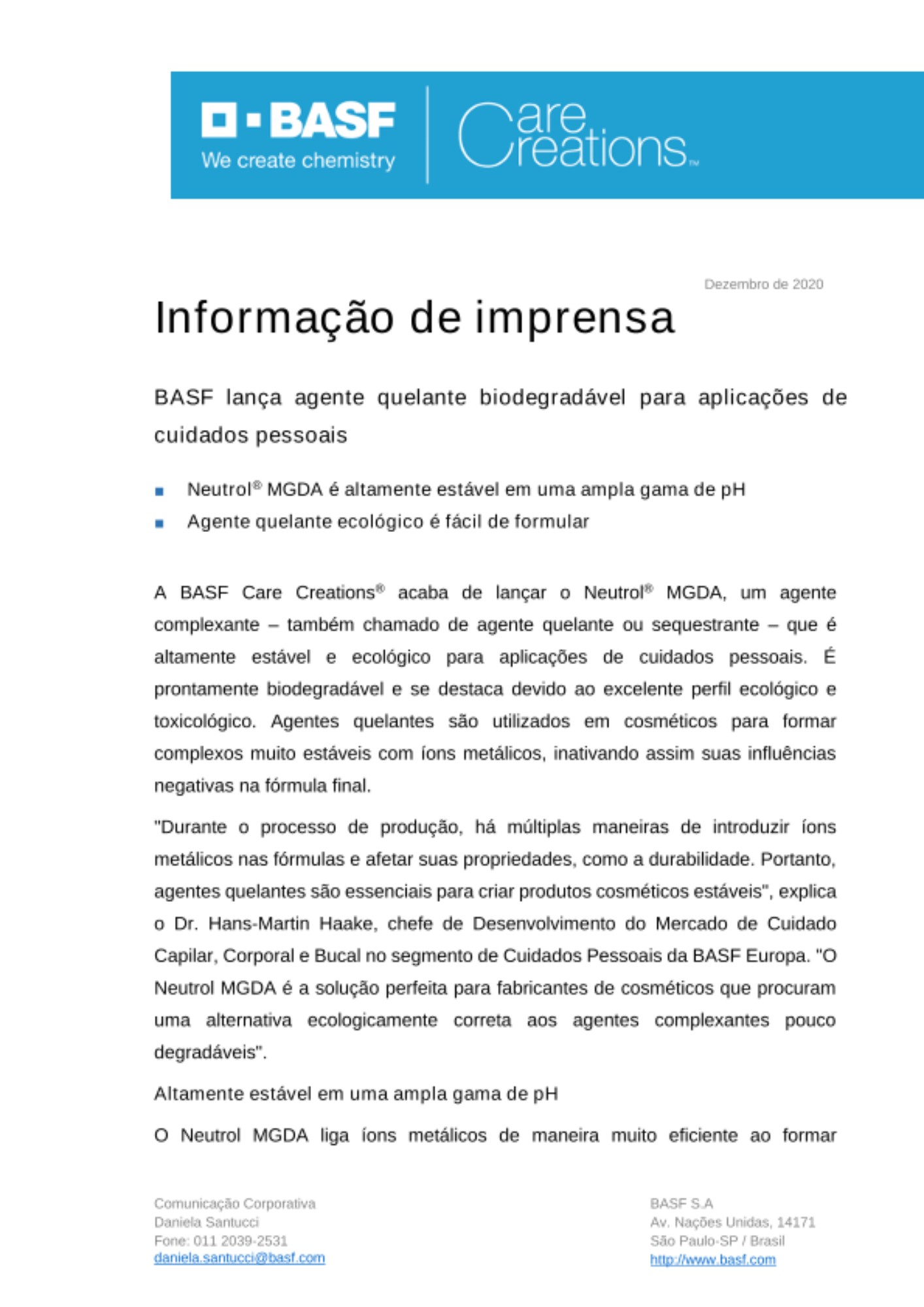 "Durante o processo de produção, há múltiplas maneiras de introduzir íons metálicos nas fórmulas e afetar suas propriedades, como a durabilidade. Portanto, agentes quelantes são essenciais para criar produtos cosméticos estáveis", explica o Dr. Hans-Martin Haake, chefe de Desenvolvimento do Mercado de Cuidado Capilar, Corporal e Bucal no segmento de Cuidados Pessoais da BASF Europa. "O Neutrol MGDA é a solução perfeita para fabricantes de cosméticos que procuram uma alternativa ecologicamente correta aos agentes complexantes pouco degradáveis".