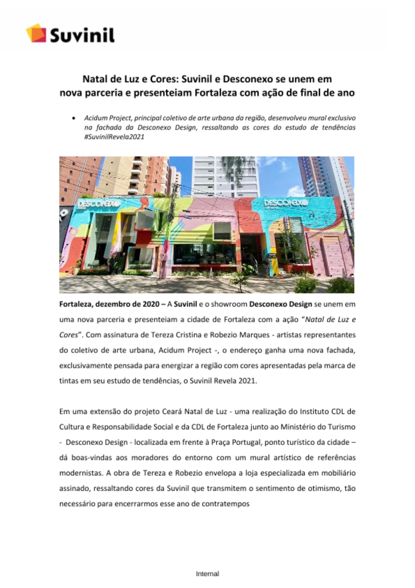 Em uma extensão do projeto Ceará Natal de Luz - uma realização do Instituto CDL de Cultura e Responsabilidade Social e da CDL de Fortaleza junto ao Ministério do Turismo - Desconexo Design - localizada em frente à Praça Portugal, ponto turístico da cidade – dá boas-vindas aos moradores do entorno com um mural artístico de referências modernistas. A obra de Tereza e Robezio envelopa a loja especializada em mobiliário assinado, ressaltando cores da Suvinil que transmitem o sentimento de otimismo, tão necessário para encerrarmos esse ano de contratempos.