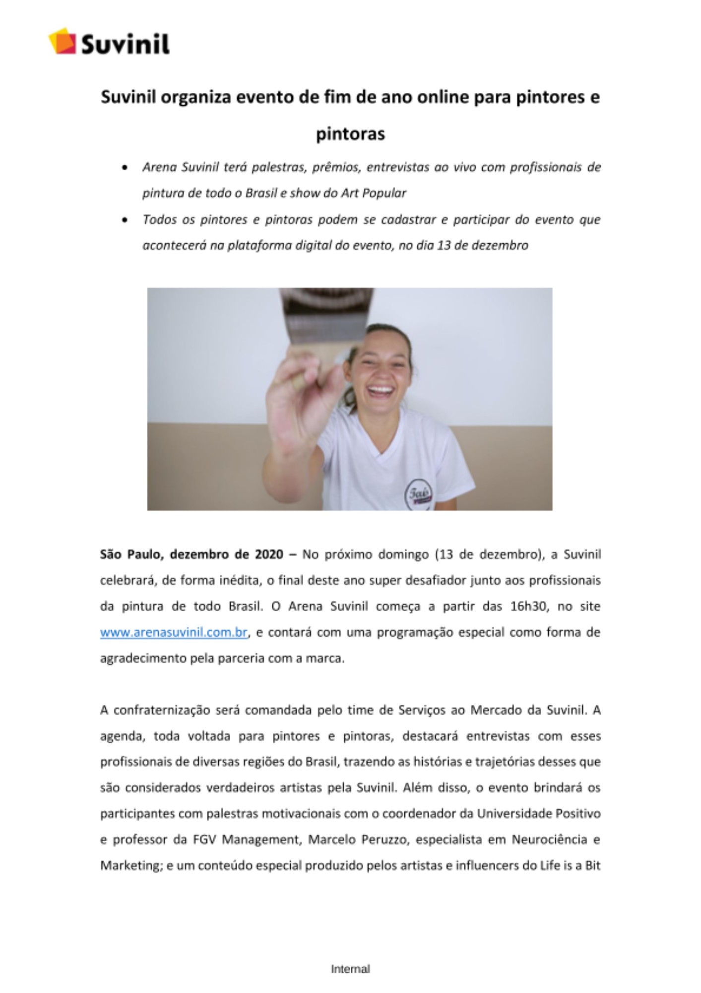 No próximo domingo (13 de dezembro), a Suvinil celebrará, de forma inédita, o final deste ano super desafiador junto aos profissionais da pintura de todo Brasil. O Arena Suvinil começa a partir das 16h30, no sitewww.arenasuvinil.com.br, e contará com uma programação especial como forma de agradecimento pela parceria com a marca.