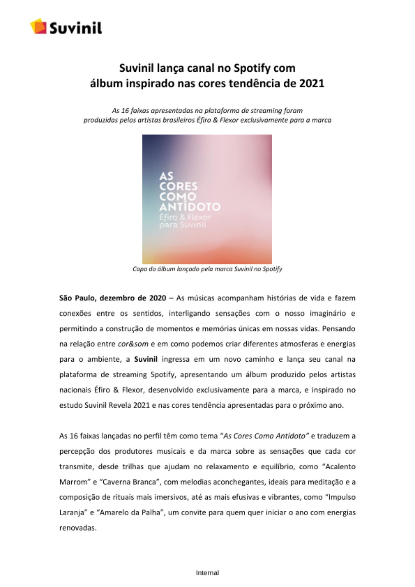 As músicas acompanham histórias de vida e fazem conexões entre os sentidos, interligando sensações com o nosso imaginário e permitindo a construção de momentos e memórias únicas em nossas vidas. Pensando na relação entre cor&som e em como podemos criar diferentes atmosferas e energias para o ambiente, a Suvinil ingressa em um novo caminho e lança seu canal na plataforma de streaming Spotify, apresentando um álbum produzido pelos artistas nacionais Éfiro & Flexor, desenvolvido exclusivamente para a marca, e inspirado no estudo Suvinil Revela 2021 e nas cores tendência apresentadas para o próximo ano.