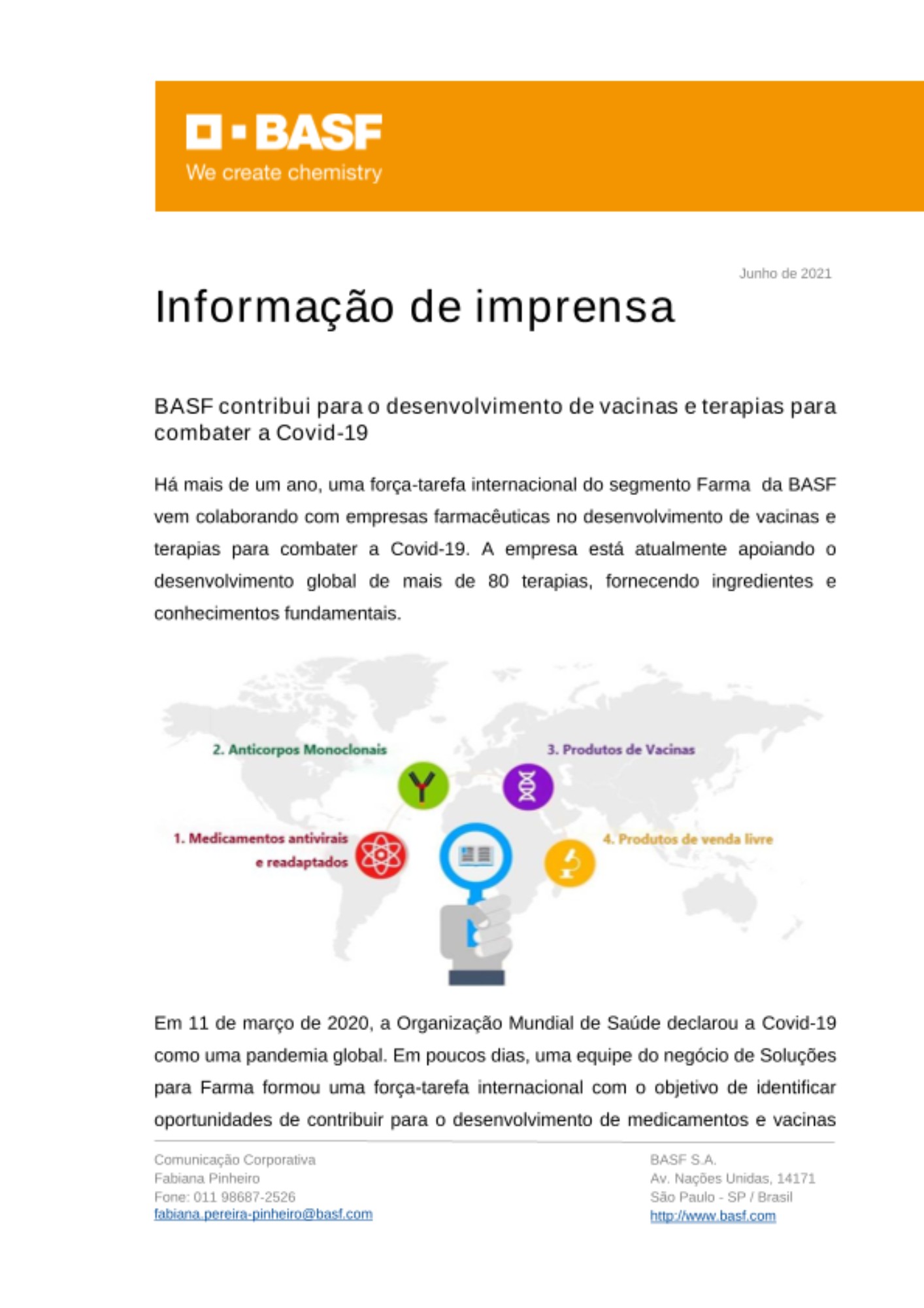 Há mais de um ano, uma força-tarefa internacional do segmento Farma da BASF vem colaborando com empresas farmacêuticas no desenvolvimento de vacinas e terapias para combater a Covid-19. A empresa está atualmente apoiando o desenvolvimento global de mais de 80 terapias, fornecendo ingredientes e conhecimentos fundamentais.