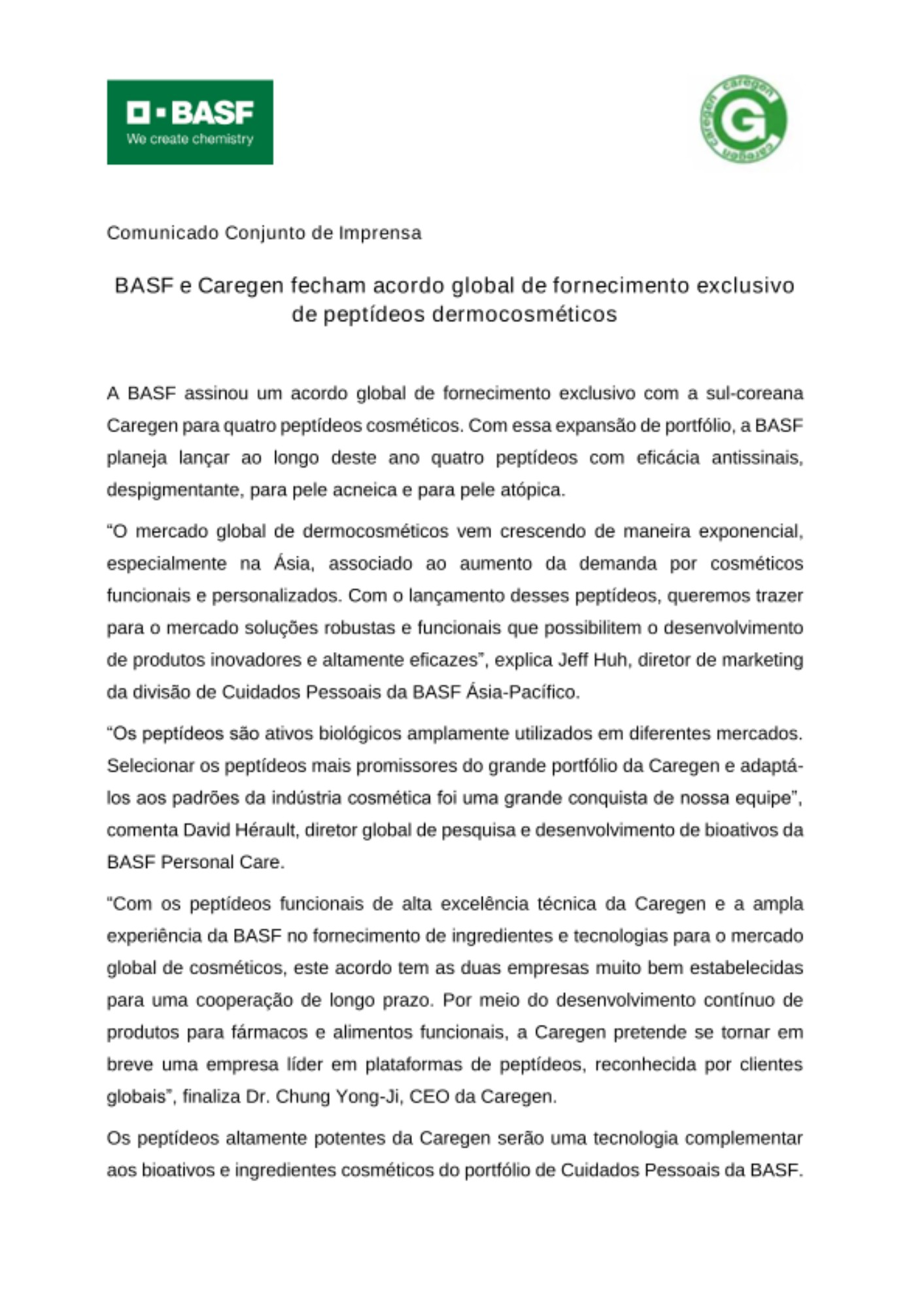 “Com os peptídeos funcionais de alta excelência técnica da Caregen e a ampla experiência da BASF no fornecimento de ingredientes e tecnologias para o mercado global de cosméticos, este acordo tem as duas empresas muito bem estabelecidas para uma cooperação de longo prazo. Por meio do desenvolvimento contínuo de produtos para fármacos e alimentos funcionais, a Caregen pretende se tornar em breve uma empresa líder em plataformas de peptídeos, reconhecida por clientes globais”, finaliza Dr. Chung Yong-Ji, CEO da Caregen.