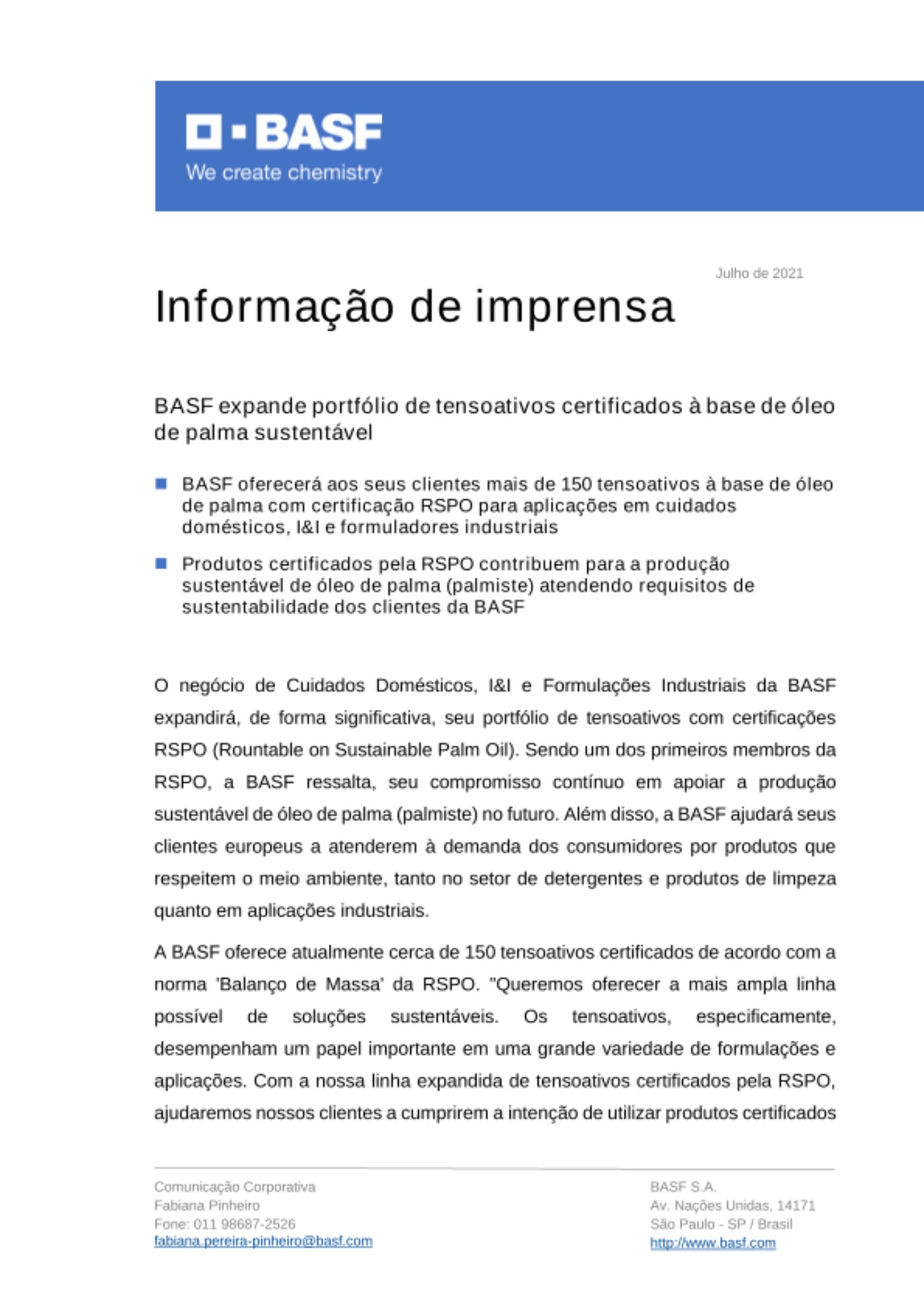 - BASF oferecerá aos seus clientes mais de 150 tensoativos à base de óleo de palma com certificação RSPO para aplicações em cuidados domésticos, I&I e formuladores industriais