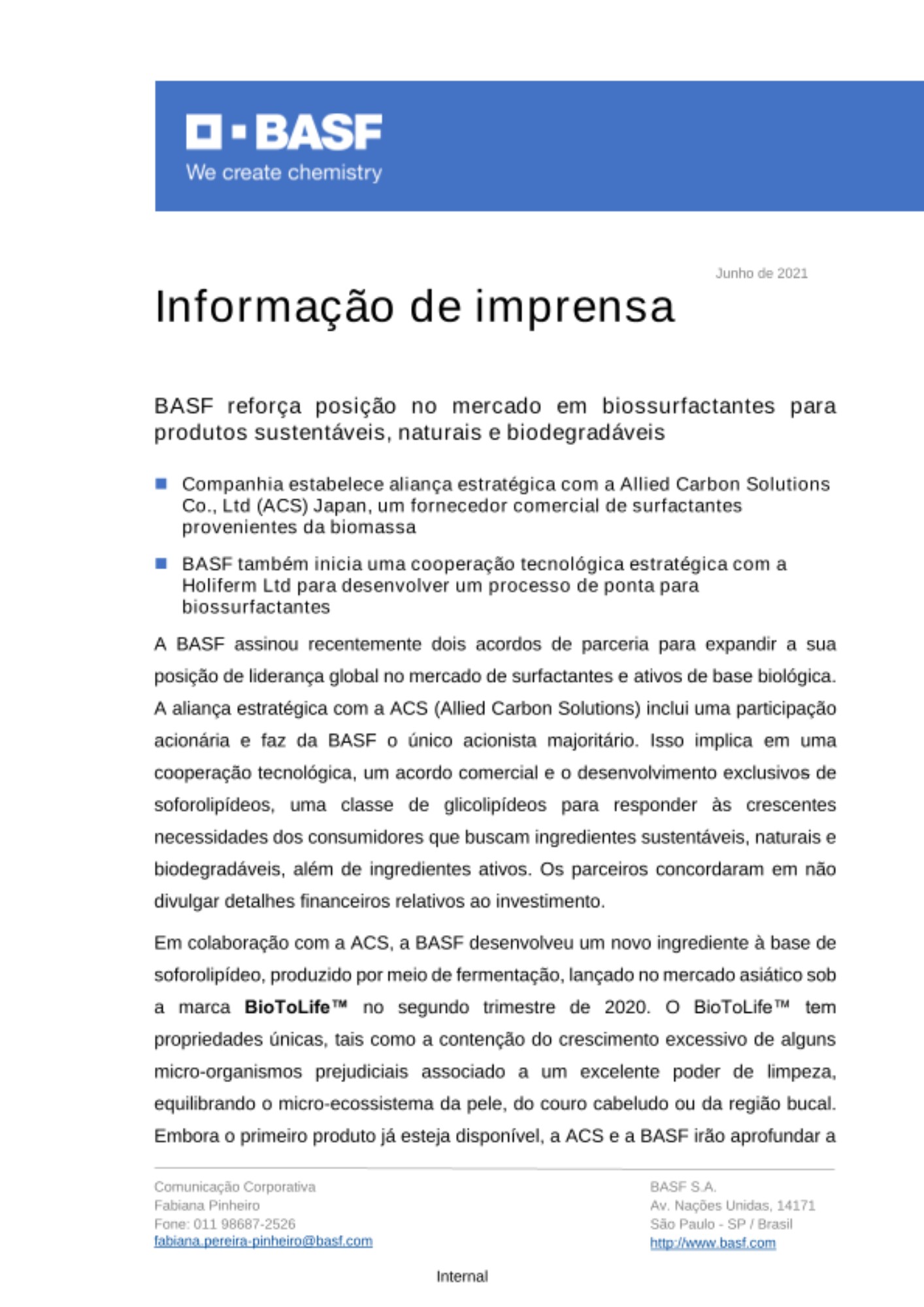 Em colaboração com a ACS, a BASF desenvolveu um novo ingrediente à base de soforolipídeo, produzido por meio de fermentação, lançado no mercado asiático sob a marca BioToLife™ no segundo trimestre de 2020. O BioToLife™ tem propriedades únicas, tais como a contenção do crescimento excessivo de alguns micro-organismos prejudiciais associado a um excelente poder de limpeza, equilibrando o micro-ecossistema da pele, do couro cabeludo ou da região bucal. Embora o primeiro produto já esteja disponível, a ACS e a BASF irão aprofundar a colaboração para focar no desenvolvimento de uma gama de formulações à base de soforolipídeo com desempenho direcionado.