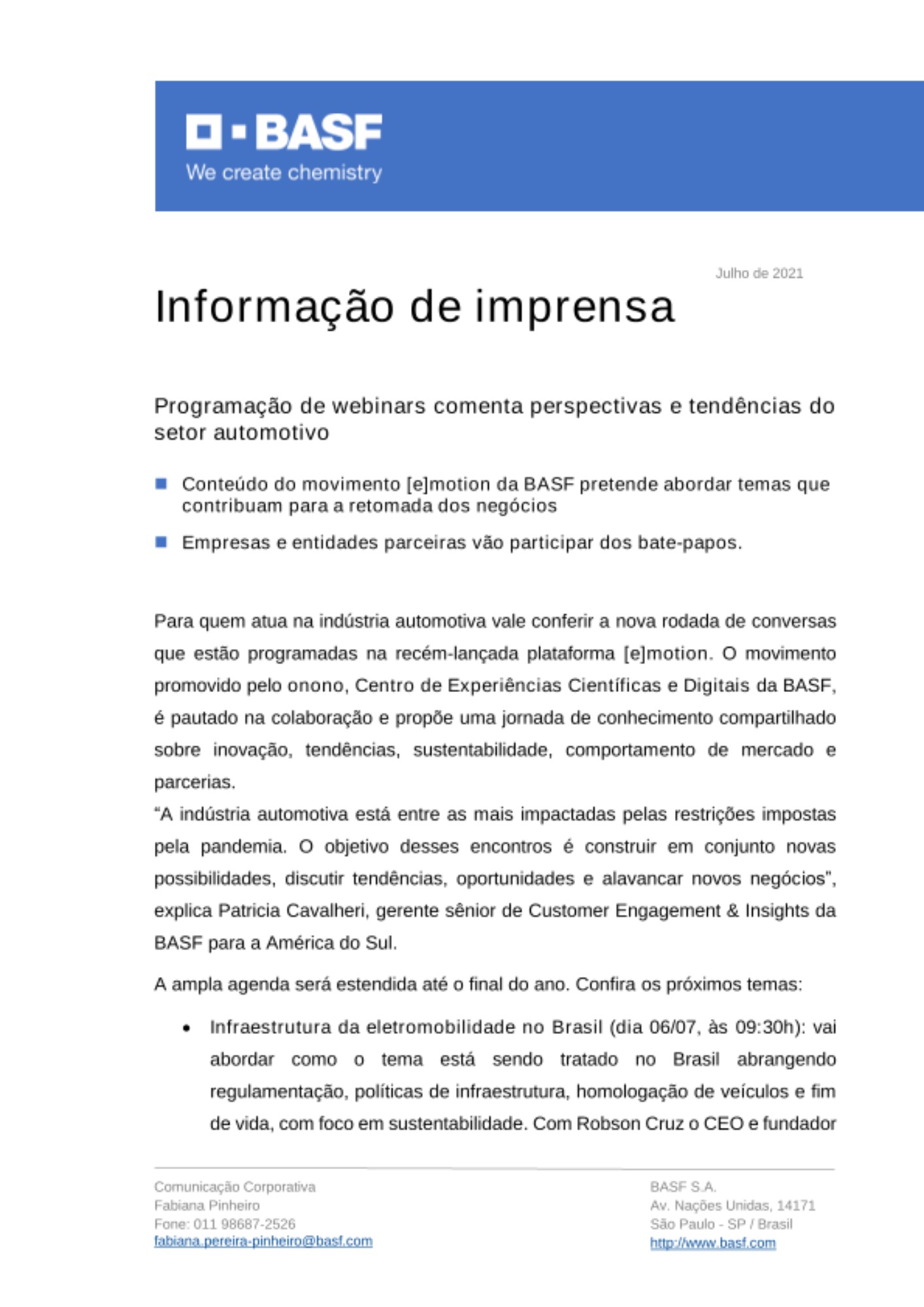 “A indústria automotiva está entre as mais impactadas pelas restrições impostas pela pandemia. O objetivo desses encontros é construir em conjunto novas possibilidades, discutir tendências, oportunidades e alavancar novos negócios”, explica Patricia Cavalheri, gerente sênior de Customer Engagement & Insights da BASF para a América do Sul.