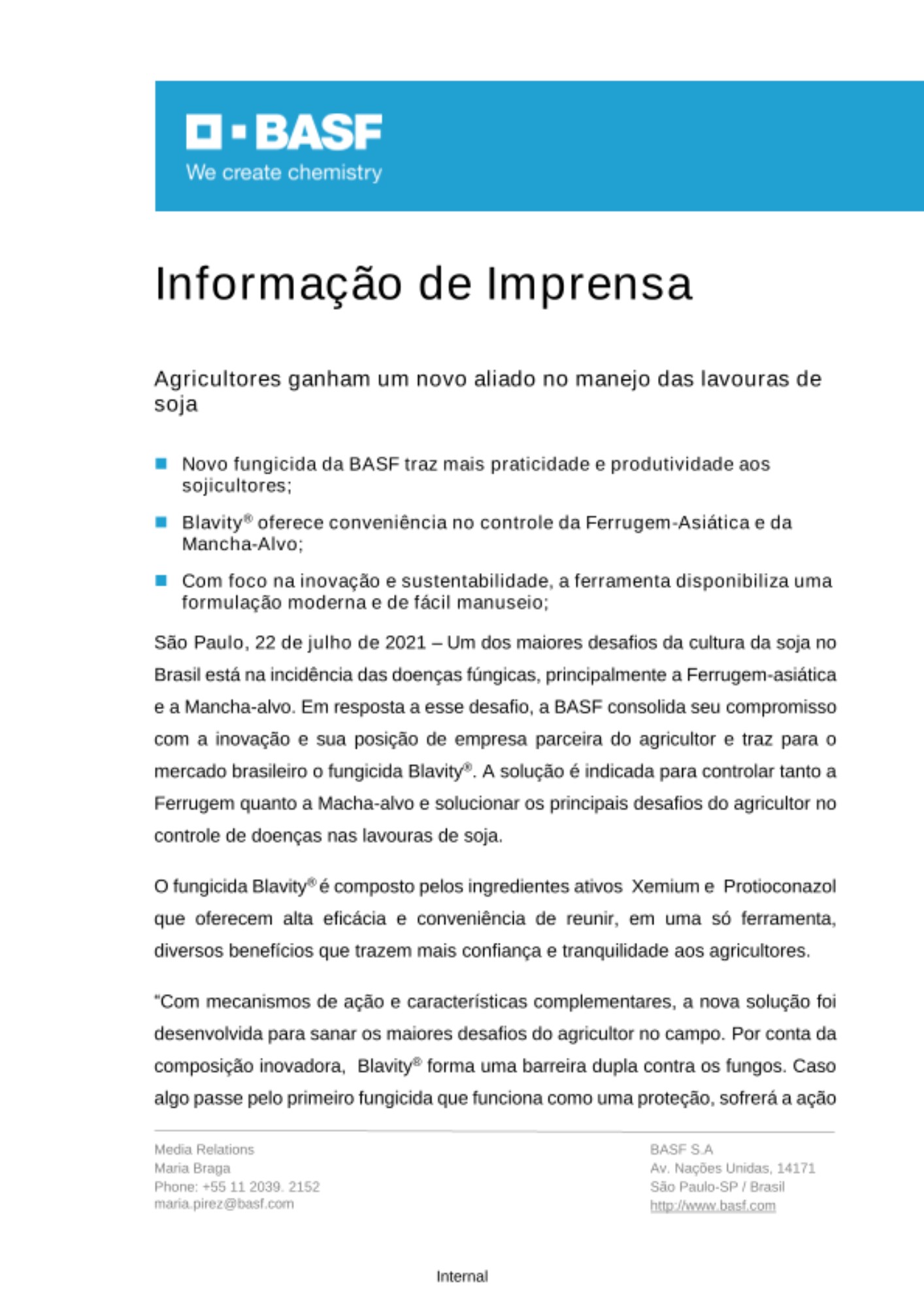 O fungicida Blavity® faz parte do forte investimento de mais de € 900 milhões por ano em pesquisa e desenvolvimento de soluções para agricultura da BASF. Até 2030, a empresa deve trazer mais de 30 novas soluções e tecnologias para os agricultores brasileiros entre proteção de cultivos e traits de sementes, além de dezenas de variedades de sementes de soja, algodão, arroz e diversas ferramentas digitais.