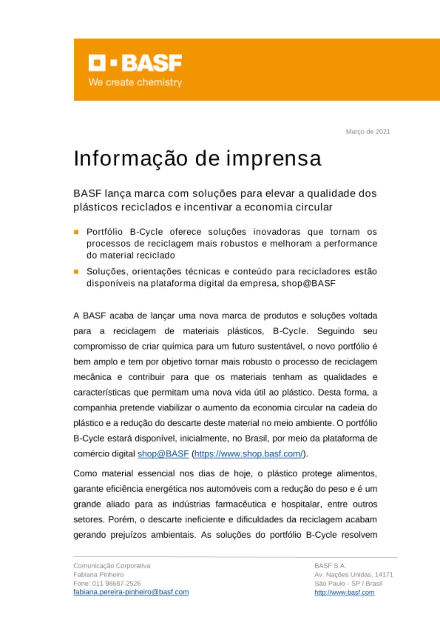 A BASF acaba de lançar uma nova marca de produtos e soluções voltada para a reciclagem de materiais plásticos, B-Cycle. Seguindo seu compromisso de criar química para um futuro sustentável, o novo portfólio é bem amplo e tem por objetivo tornar mais robusto o processo de reciclagem mecânica e contribuir para que os materiais tenham as qualidades e características que permitam uma nova vida útil ao plástico. Desta forma, a companhia pretende viabilizar o aumento da economia circular na cadeia do plástico e a redução do descarte deste material no meio ambiente. O portfólio B-Cycle estará disponível, inicialmente, no Brasil, por meio da plataforma de comércio digital shop@BASF (https://www.shop.basf.com/).
