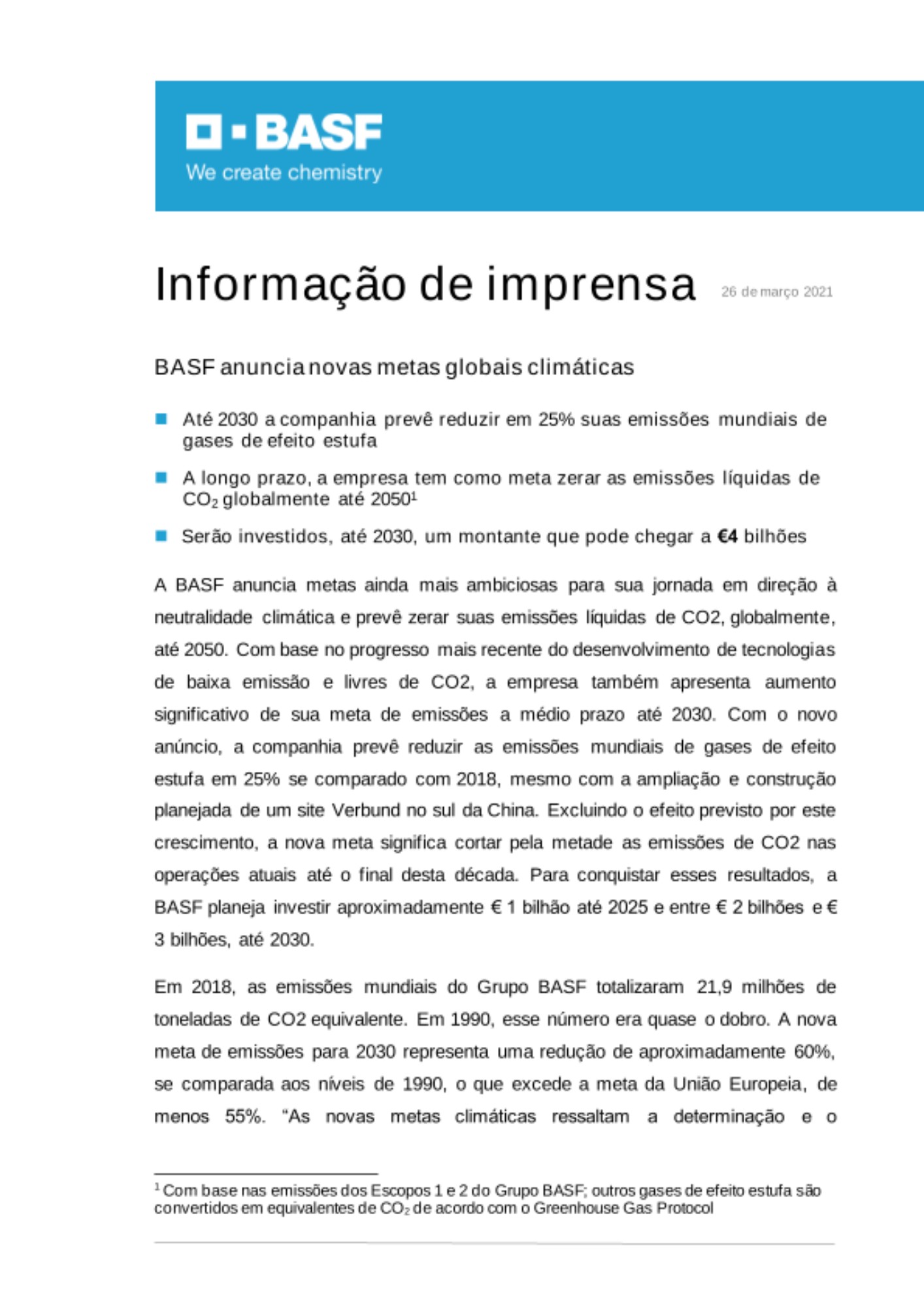 Em 2018, as emissões mundiais do Grupo BASF totalizaram 21,9 milhões de toneladas de CO2 equivalente. Em 1990, esse número era quase o dobro. A nova meta de emissões para 2030 representa uma redução de aproximadamente 60%, se comparada aos níveis de 1990, o que excede a meta da União Europeia, de menos 55%. “As novas metas climáticas ressaltam a determinação e o compromisso da BASF com o Acordo Climático de Paris. As mudanças climáticas são o maior desafio do século XXI, por isso devemos adaptar nossos processos e nosso portfólio de produtos. Agora precisamos acelerar essa transformação. Devemos primeiro nos focar nas etapas iniciais desta jornada, não nas finais. É por isso que a BASF aumentará o uso de energias renováveis. E vamos acelerar o desenvolvimento e implantação de novos processos livres de CO2 para a produção dos químicos. Com transparência e ofertas para reduzir de forma sistemática e gradual a pegada de carbono dos produtos BASF em toda a cadeia de valor, nós ajudamos nossos clientes em todas as indústrias a reduzir a pegada de carbono de seus próprios produtos”, disse o Dr. Martin Brudermüller, Presidente do Conselho de Administração da BASF SE.
