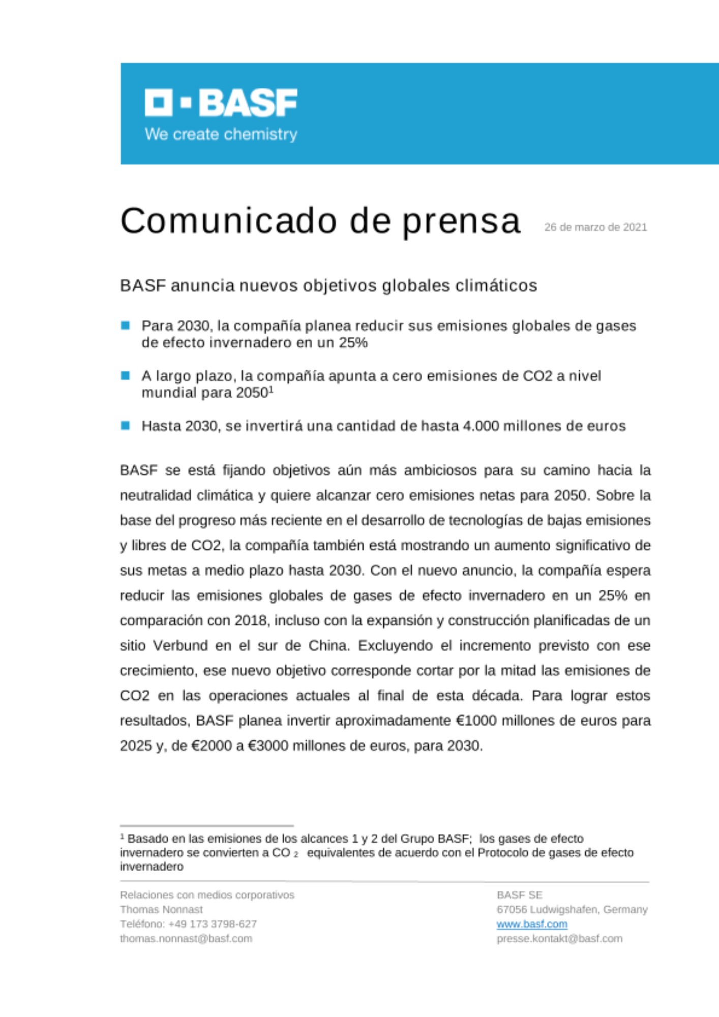BASF se está fijando objetivos aún más ambiciosos para su camino hacia la neutralidad climática y quiere alcanzar cero emisiones netas para 2050. Sobre la base del progreso más reciente en el desarrollo de tecnologías de bajas emisiones y libres de CO2, la compañía también está mostrando un aumento significativo de sus metas a medio plazo hasta 2030. Con el nuevo anuncio, la compañía espera reducir las emisiones globales de gases de efecto invernadero en un 25% en comparación con 2018, incluso con la expansión y construcción planificadas de un sitio Verbund en el sur de China. Excluyendo el incremento previsto con ese crecimiento, ese nuevo objetivo corresponde cortar por la mitad las emisiones de CO2 en las operaciones actuales al final de esta década. Para lograr estos resultados, BASF planea invertir aproximadamente €1000 millones de euros para 2025 y, de €2000 a €3000 millones de euros, para 2030.