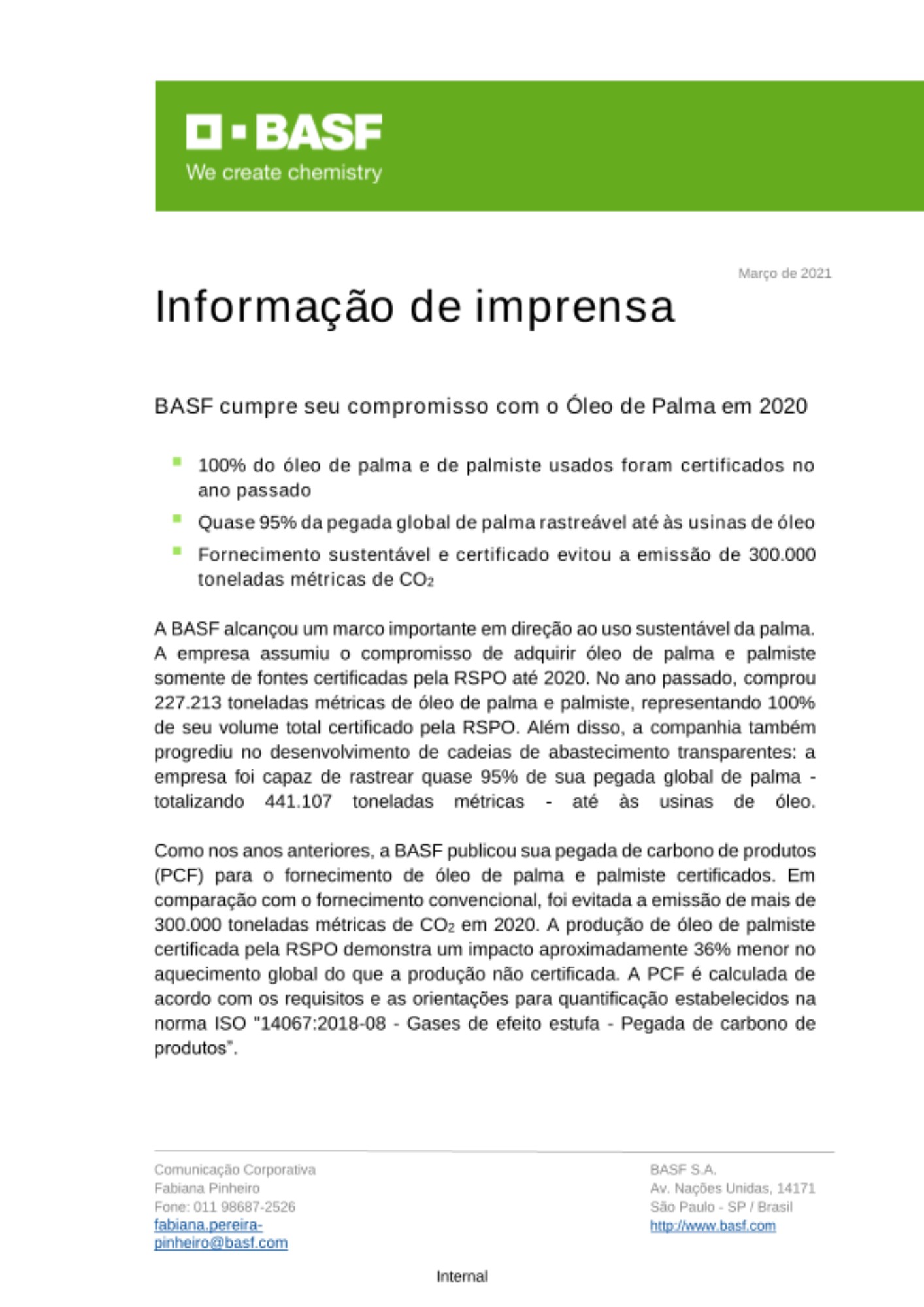 Como nos anos anteriores, a BASF publicou sua pegada de carbono de produtos (PCF) para fornecer óleo de palma e palmiste certificados. Em comparação com o convencional, foi evitada a emissão de mais de 300.000 toneladas métricas de CO 2 em 2020. A produção de óleo de palmiste certificada pela RSPO demonstração um impacto aproximadamente 36% menor no aquecimento global do que a produção não certificada. A PCF é calculada de acordo com os requisitos e orientações para quantificação obtida na norma ISO "14067: 2018-08 - Gases de efeito estufa - Pegada de carbono de produtos".