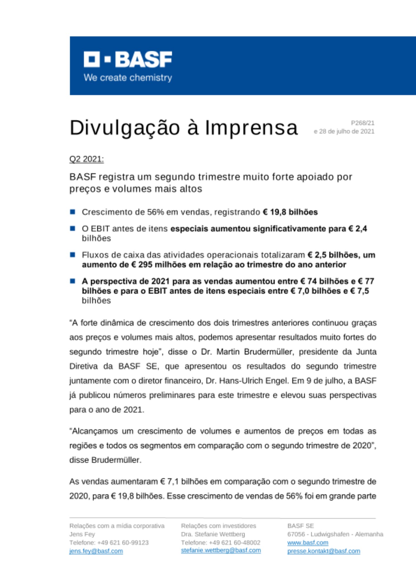 “A forte dinâmica de crescimento dos dois trimestres anteriores continuou graças aos preços e volumes mais altos, podemos apresentar resultados muito fortes do segundo trimestre hoje”, disse o Dr. Martin Brudermüller, presidente da Junta Diretiva da BASF SE, que apresentou os resultados do segundo trimestre juntamente com o diretor financeiro, Dr. Hans-Ulrich Engel. Em 9 de julho, a BASF já publicou números preliminares para este trimestre e elevou suas perspectivas para o ano de 2021.