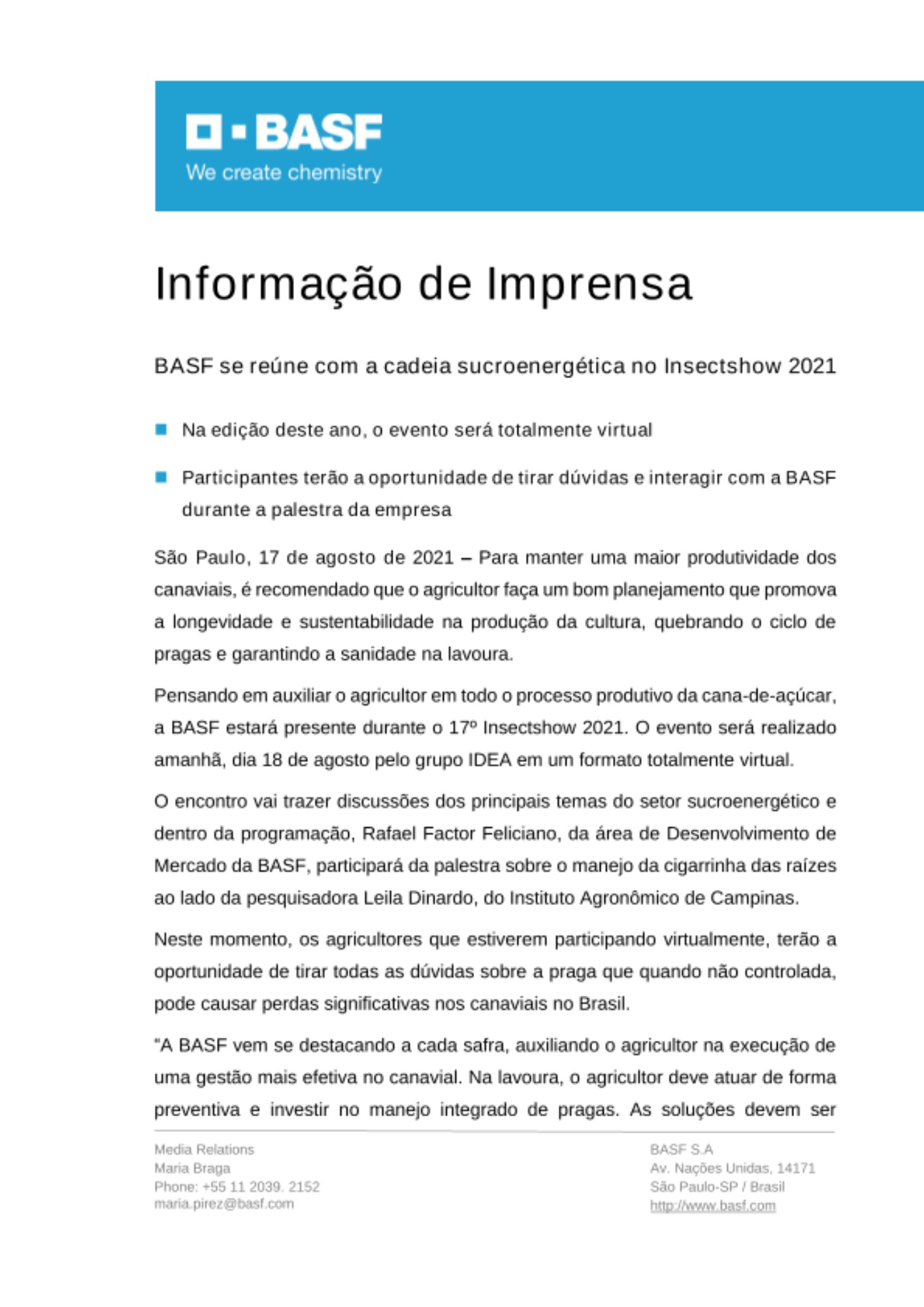 Pensando em auxiliar o agricultor em todo o processo produtivo da cana-de-açúcar, a BASF estará presente durante o 17º Insectshow 2021. O evento será realizado amanhã, dia 18 de agosto pelo grupo IDEA em um formato totalmente virtual.
