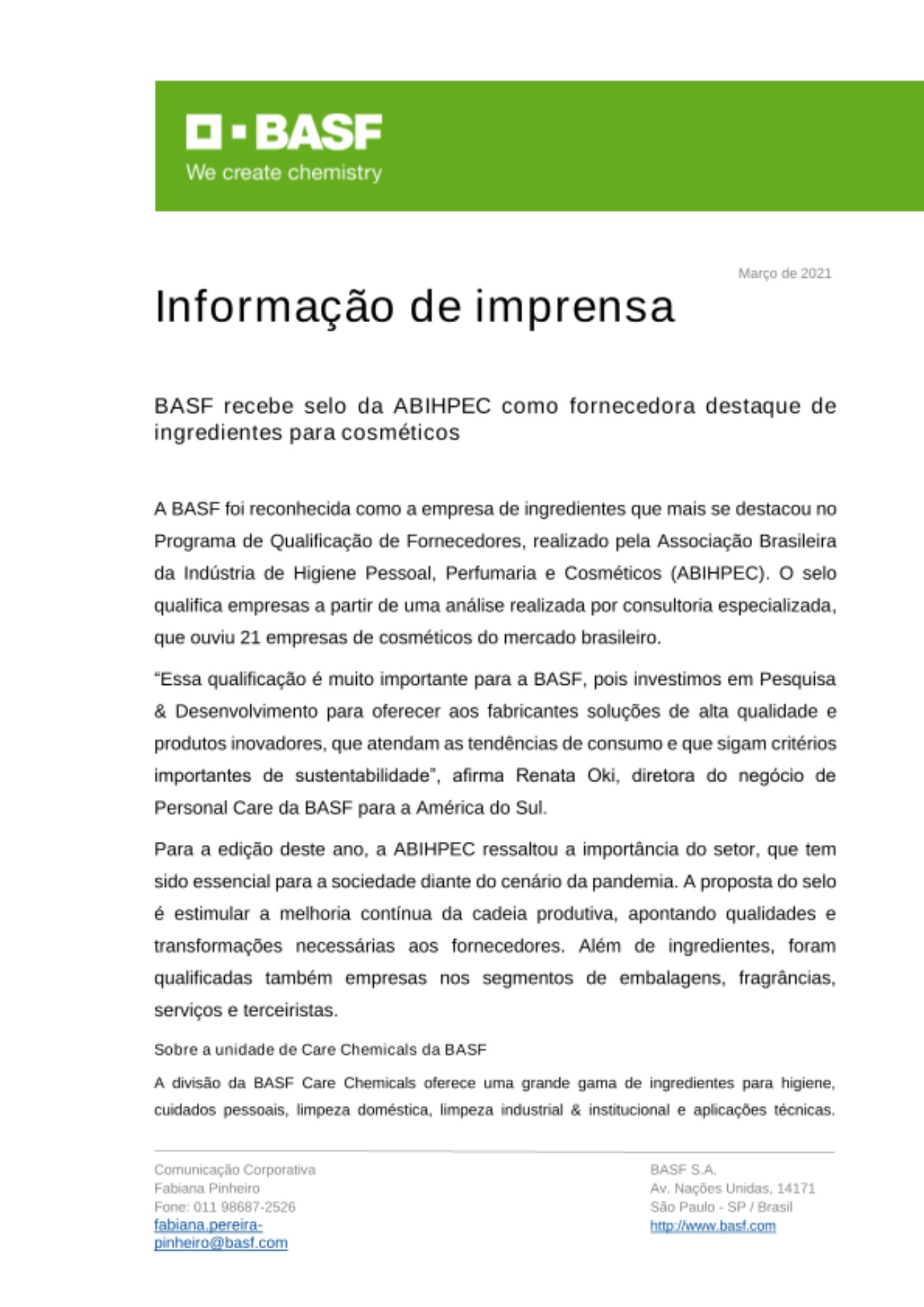 “Essa qualificação é muito importante para a BASF, pois investimos em Pesquisa & Desenvolvimento para oferecer aos fabricantes soluções de alta qualidade e produtos inovadores, que atendam as tendências de consumo e que sigam critérios importantes de sustentabilidade”, afirma Renata Oki, diretora do negócio de Personal Care da BASF para a América do Sul.
