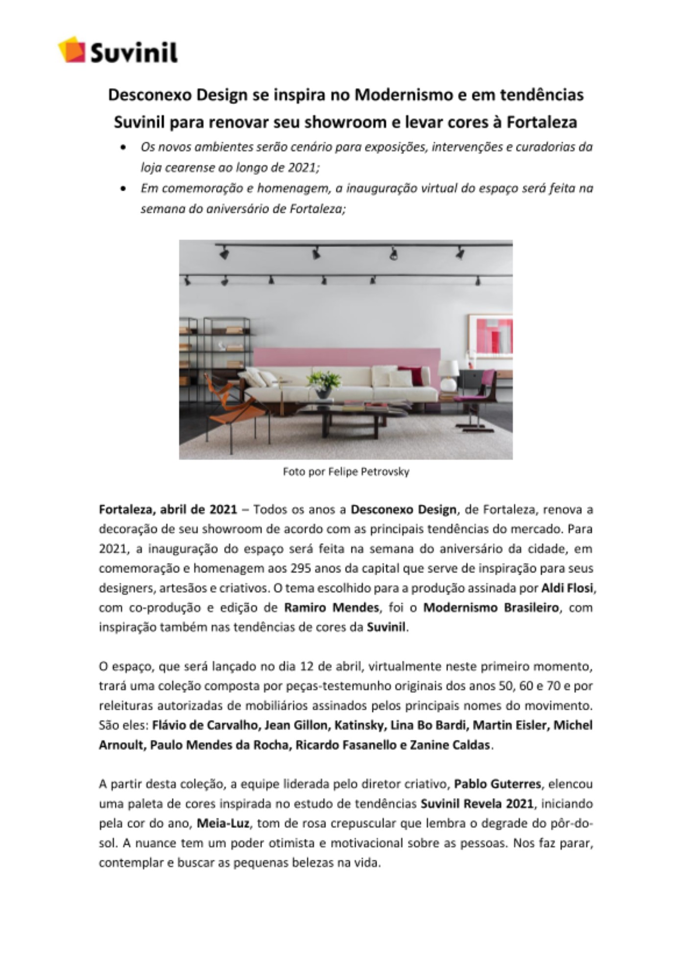 Todos os anos a Desconexo Design, de Fortaleza, renova a decoração de seu showroom de acordo com as principais tendências do mercado. Para 2021, a inauguração do espaço será feita na semana do aniversário da cidade, em comemoração e homenagem aos 295 anos da capital que serve de inspiração para seus designers, artesãos e criativos. O tema escolhido para a produção assinada por Aldi Flosi, com co-produção e edição de Ramiro Mendes, foi o Modernismo Brasileiro, com inspiração também nas tendências de cores da Suvinil.