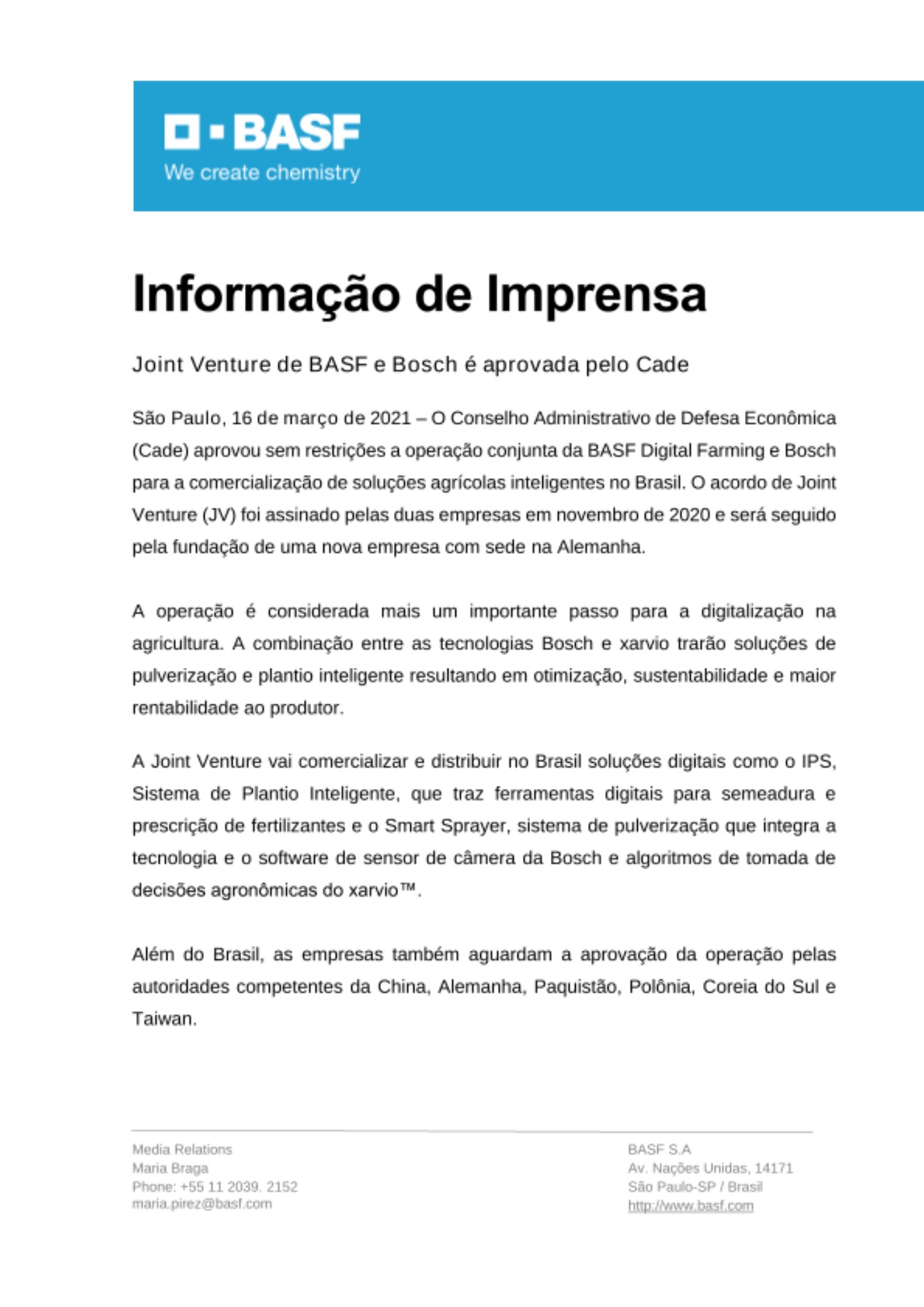 São Paulo, 16 de março de 2021 - O Conselho Administrativo de Defesa Econômica (Cade) aprovou sem restrições a operação conjunta da BASF Agricultura Digital e Bosch para comercialização de soluções agrícolas inteligentes no Brasil. O acordo de Joint Venture (JV) foi assinado pelas duas empresas em novembro de 2020 e será seguido pela fundação de uma nova empresa com sede na Alemanha.