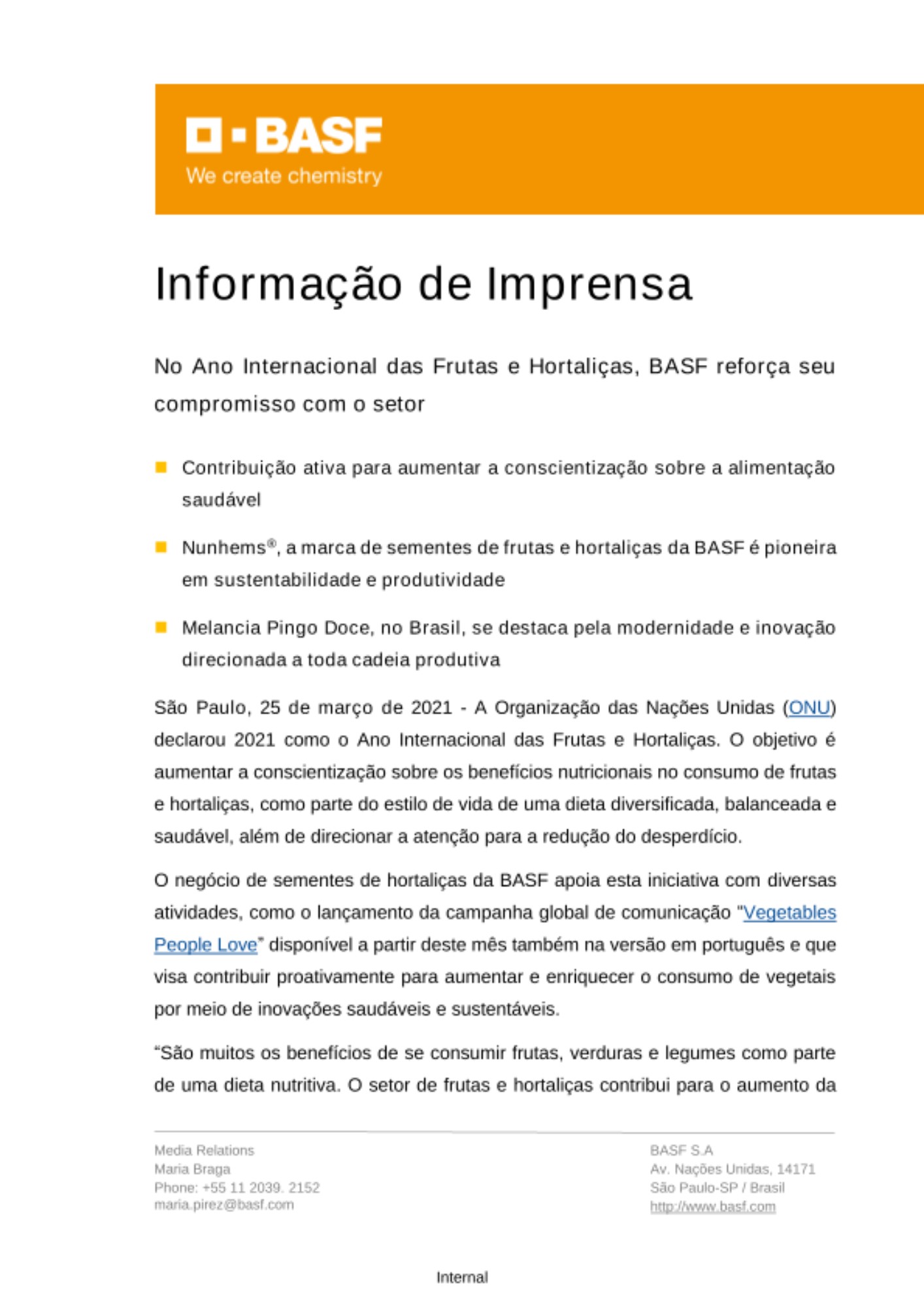 O Ano Internacional de Frutas, Verduras e Legumes 2021 é uma oportunidade única para aumentar a conscientização sobre esse importante papel dos alimentos na nutrição humana, segurança alimentar, saúde e, também, para apoiar a implementação dos Objetivos de Desenvolvimento Sustentável da ONU. “Na BASF, temos como propósito, tornar a alimentação saudável e sustentável. Temos o compromisso de compartilhar nossa experiência em relação as sementes de frutas e hortaliças e conscientizar a sociedade sobre suas vantagens de consumo”, diz Vicente Navarro.