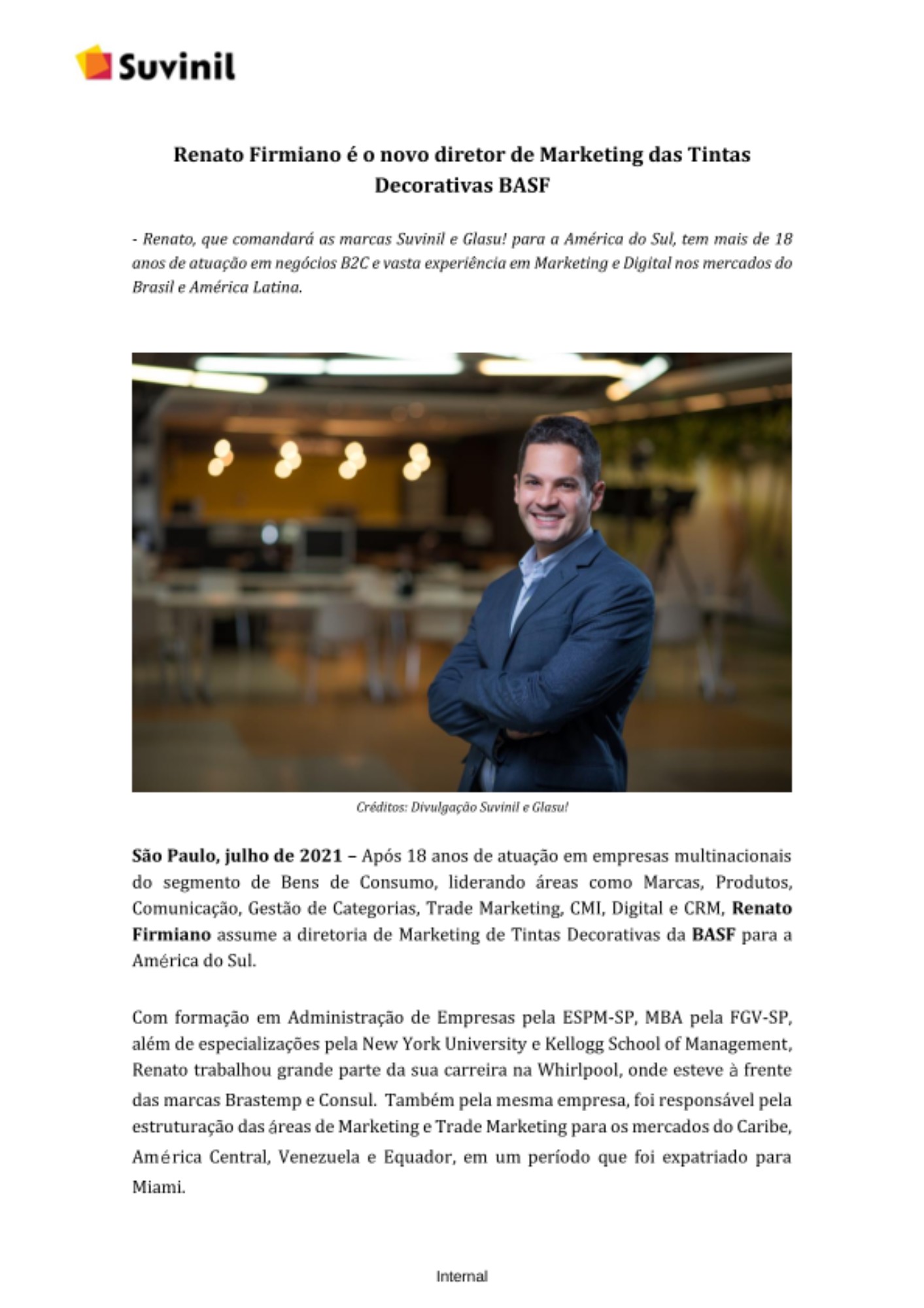 Após 18 anos de atuação em empresas multinacionais do segmento de Bens de Consumo, liderando áreas como Marcas, Produtos, Comunicação, Gestão de Categorias, Trade Marketing, CMI, Digital e CRM, RenatoFirmiano assume a diretoria de Marketing de Tintas Decorativas da BASF para a América do Sul.