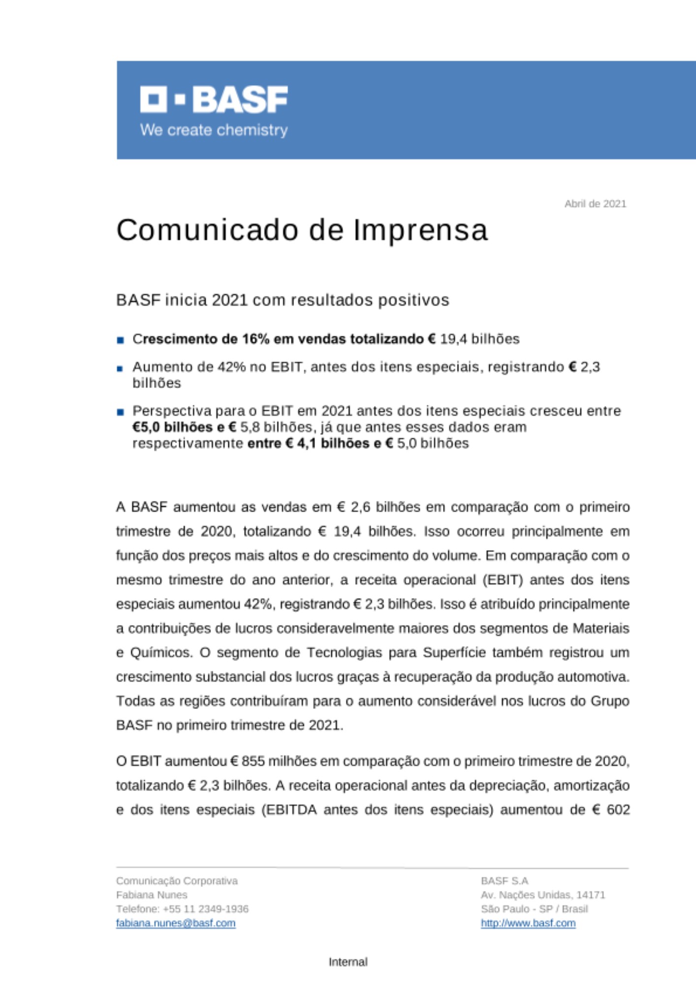 Mais informações sobre o desenvolvimento dos negócios do Grupo BASF no primeiro trimestre de 2021 podem ser encontradas no comunicado trimestral publicado hoje em basf.com/quarterlystatement.