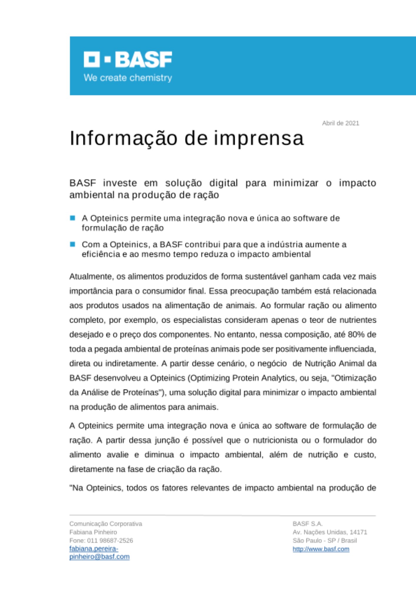 Atualmente, os alimentos produzidos de forma sustentável ganham cada vez mais importância para o consumidor final. Essa preocupação também está relacionada aos produtos usados na alimentação de animais. Ao formular ração ou alimento completo, por exemplo, os especialistas consideram apenas o teor de nutrientes desejado e o preço dos componentes. No entanto, nessa composição, até 80% de toda a pegada ambiental de proteínas animais pode ser positivamente influenciada, direta ou indiretamente. A partir desse cenário, o negócio de Nutrição Animal da BASF desenvolveu a Opteinics (Optimizing Protein Analytics, ou seja, "Otimização da Análise de Proteínas"), uma solução digital para minimizar o impacto ambiental na produção de alimentos para animais.