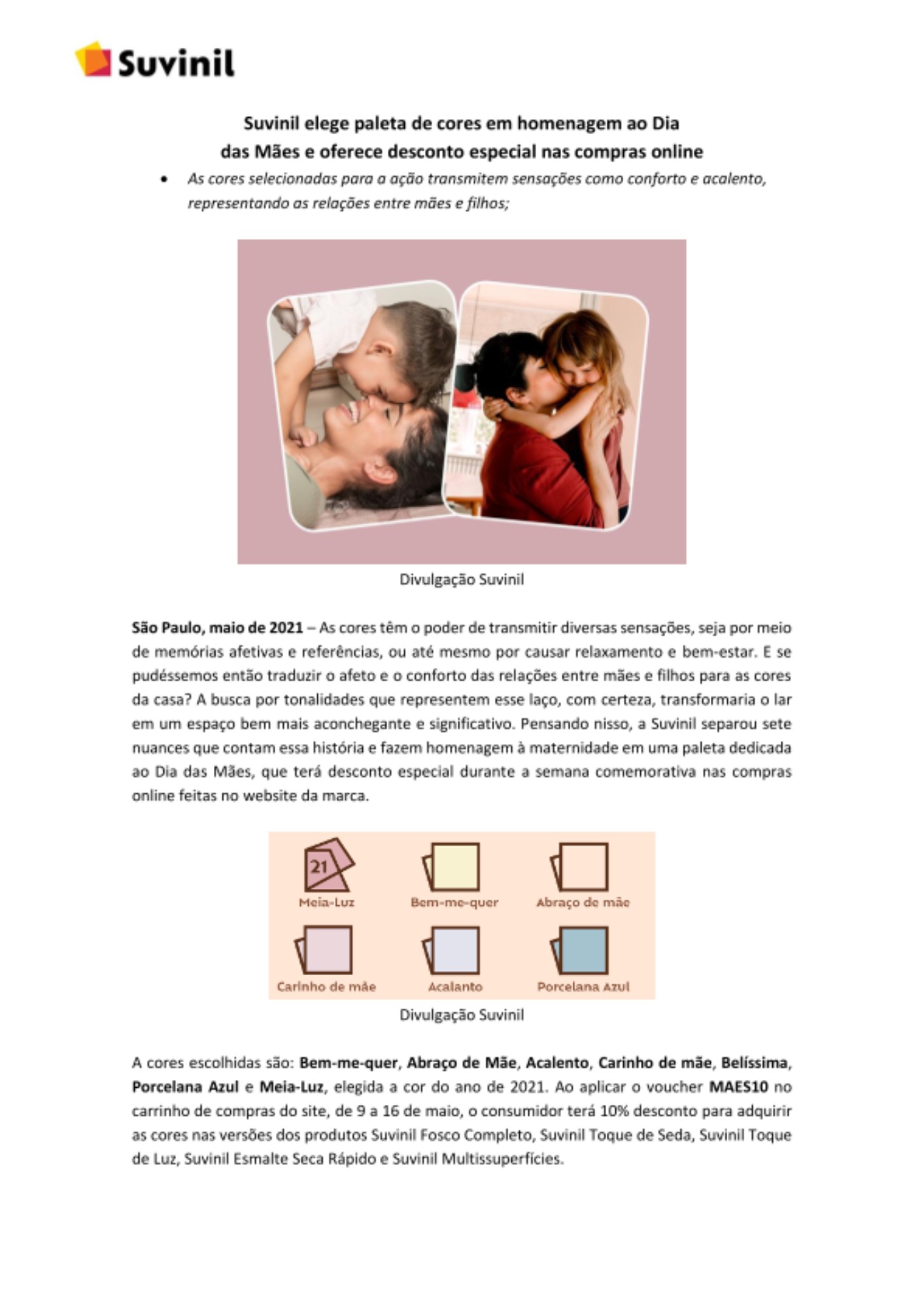 A cores escolhidas são: Bem-me-quer, Abraço de Mãe, Acalento, Carinho de mãe, Belíssima, Porcelana Azul e Meia-Luz, elegida a cor do ano de 2021. Ao aplicar o voucher MAES10 no carrinho de compras do site, de 9 a 16 de maio, o consumidor terá 10% desconto para adquirir as cores nas versões dos produtos Suvinil Fosco Completo, Suvinil Toque de Seda, Suvinil Toque de Luz, Suvinil Esmalte Seca Rápido e Suvinil Multissuperfícies.