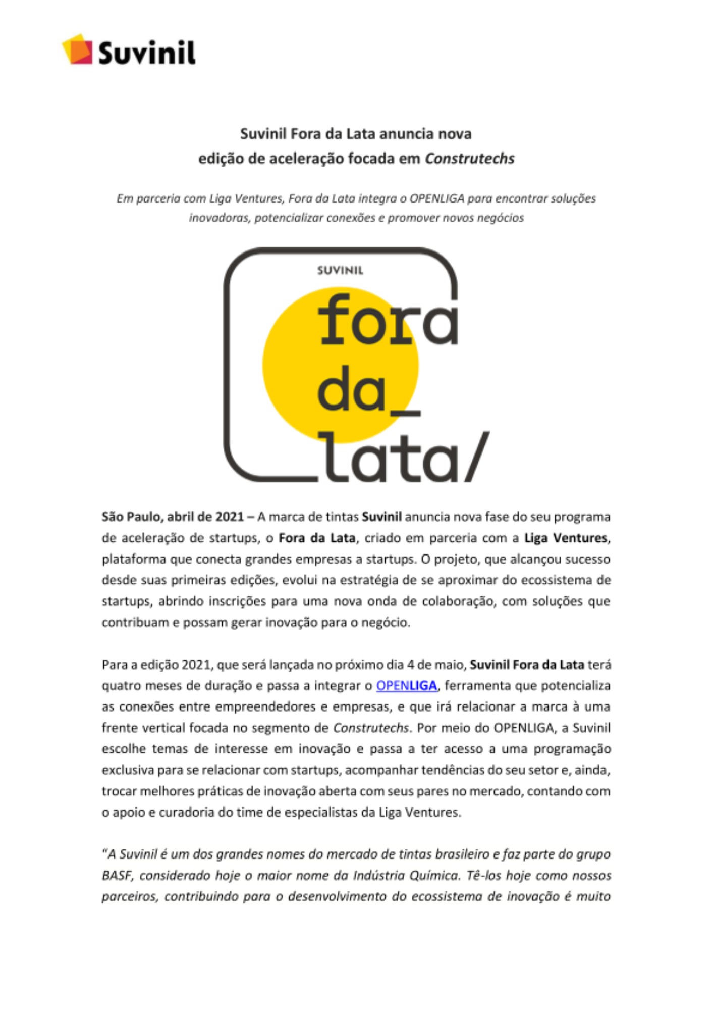 Para a edição 2021, que será lançada no próximo dia 4 de maio, Suvinil Fora da Lata terá quatro meses de duração e passa a integrar o OPENLIGA, ferramenta que potencializa as conexões entre empreendedores e empresas, e que irá relacionar a marca à uma frente vertical focada no segmento de Construtechs. Por meio do OPENLIGA, a Suvinil escolhe temas de interesse em inovação e passa a ter acesso a uma programação exclusiva para se relacionar com startups, acompanhar tendências do seu setor e, ainda, trocar melhores práticas de inovação aberta com seus pares no mercado, contando com o apoio e curadoria do time de especialistas da Liga Ventures.
