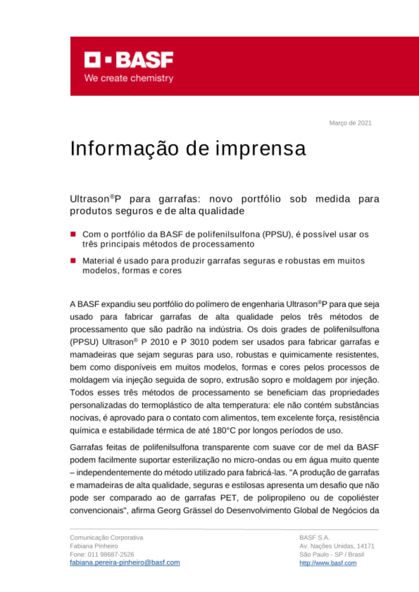 Garrafas feitas de polifenilsulfona transparente com suave cor de mel da BASF podem facilmente suportar esterilização no micro-ondas ou em água muito quente – independentemente do método utilizado para fabricá-las. "A produção de garrafas e mamadeiras de alta qualidade, seguras e estilosas apresenta um desafio que não pode ser comparado ao de garrafas PET, de polipropileno ou de copoliéster convencionais", afirma Georg Grässel do Desenvolvimento Global de Negócios da BASF Ultrason®. "Todos os métodos de processamento globalmente difundidos têm seus próprios requerimentos específicos para o material utilizado – e é aqui que o Ultrason® P provou seu valor para clientes em diversos países. Eles podem escolher o material mais adequado do nosso portfólio e podem se beneficiar do suporte técnico de aplicação no local, assim como da disponibilidade global de diferentes grades”.