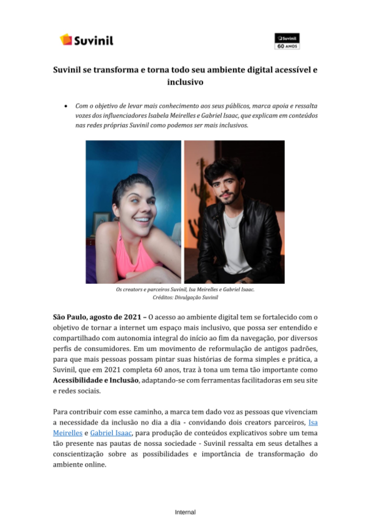 Para contribuir com esse caminho, a marca tem dado voz as pessoas que vivenciam a necessidade da inclusão no dia a dia - convidando dois creators parceiros, Isa Meirelles e Gabriel Isaac, para produção de conteúdos explicativos sobre um tema tão presente nas pautas de nossa sociedade - Suvinil ressalta em seus detalhes a conscientização sobre as possibilidades e importância de transformação do ambiente online.