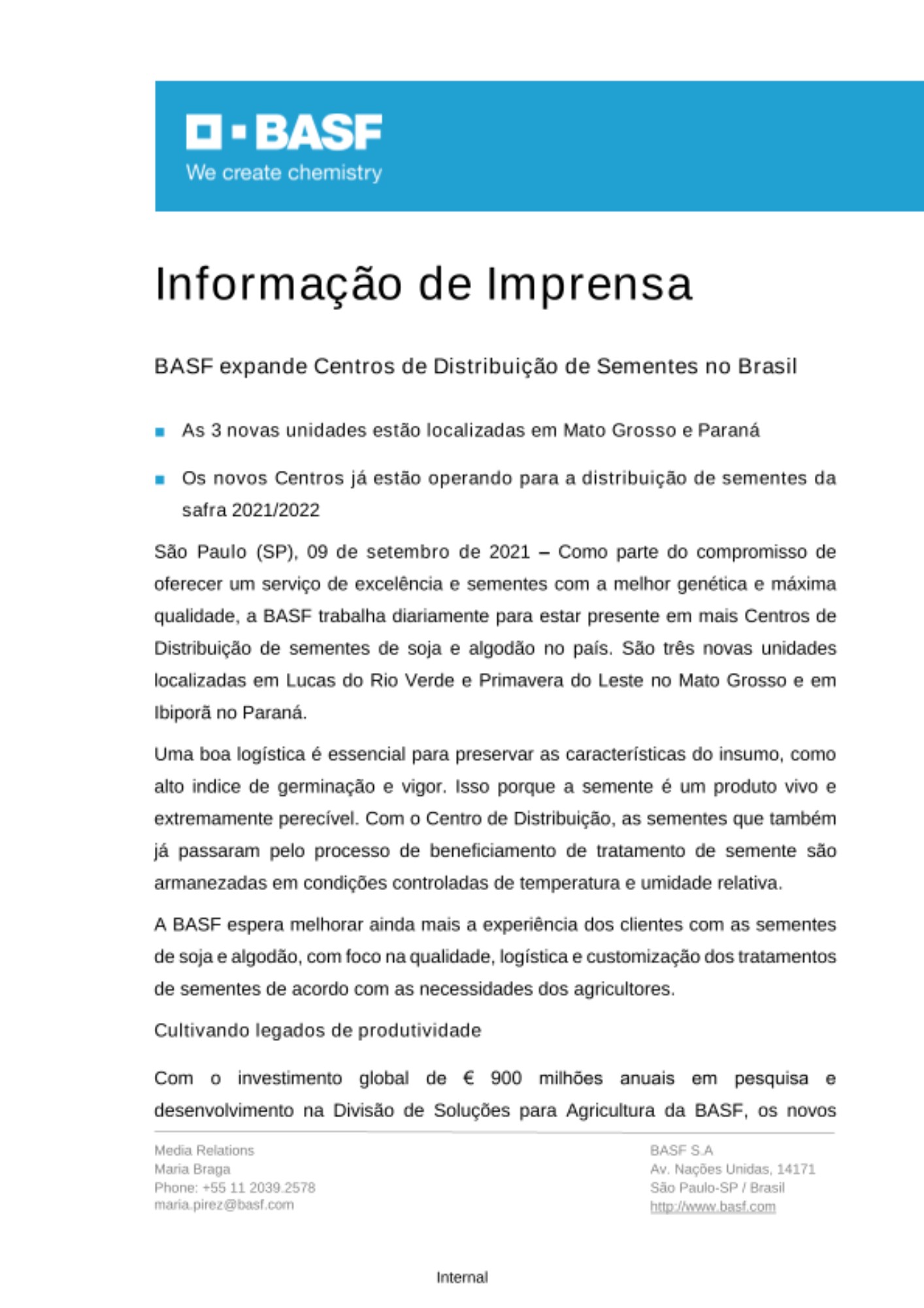 São Paulo (SP), 09 de setembro de 2021 – Como parte do compromisso de oferecer um serviço de excelência e sementes com a melhor genética e máxima qualidade, a BASF trabalha diariamente para estar presente em mais Centros de Distribuição de sementes de soja e algodão no país. São três novas unidades localizadas em Lucas do Rio Verde e Primavera do Leste no Mato Grosso e em Ibiporã no Paraná.