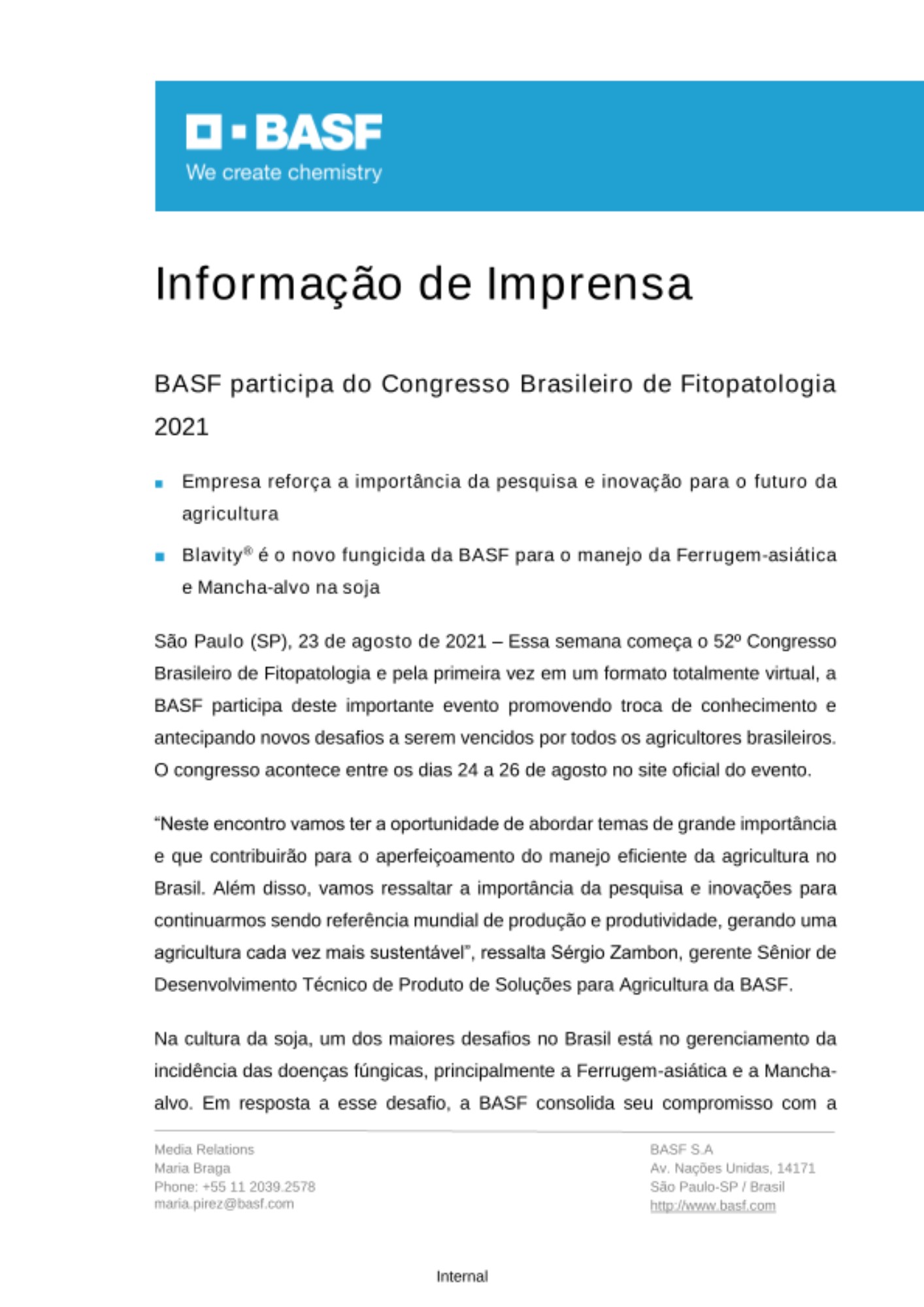São Paulo (SP), 23 de agosto de 2021 – Essa semana começa o 52º Congresso Brasileiro de Fitopatologia e pela primeira vez em um formato totalmente virtual, a BASF participa deste importante evento promovendo troca de conhecimento e antecipando novos desafios a serem vencidos por todos os agricultores brasileiros. O congresso acontece entre os dias 24 a 26 de agosto no site oficial do evento.