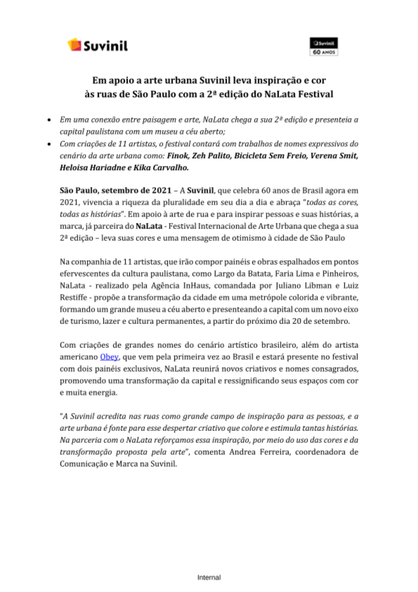 A Suvinil, que celebra 60 anos de Brasil agora em 2021, vivencia a riqueza da pluralidade em seu dia a dia e abraça “todas as cores, todas as histórias”. Em apoio à arte de rua e para inspirar pessoas e suas histórias, a marca, já parceira do NaLata - Festival Internacional de Arte Urbana que chega a sua 2ª edição – leva suas cores e uma mensagem de otimismo à cidade de São Paulo