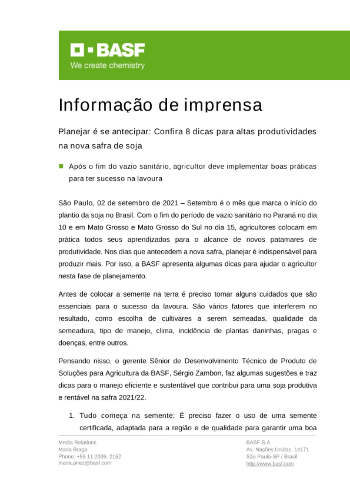 São Paulo, 02 de setembro de 2021 – Setembro é o mês que marca o início do plantio da soja no Brasil. Com o fim do período de vazio sanitário no Paraná no dia 10 e em Mato Grosso e Mato Grosso do Sul no dia 15, agricultores colocam em prática todos seus aprendizados para o alcance de novos patamares de produtividade. Nos dias que antecedem a nova safra, planejar é indispensável para produzir mais. Por isso, a BASF apresenta algumas dicas para ajudar o agricultor nesta fase de planejamento.