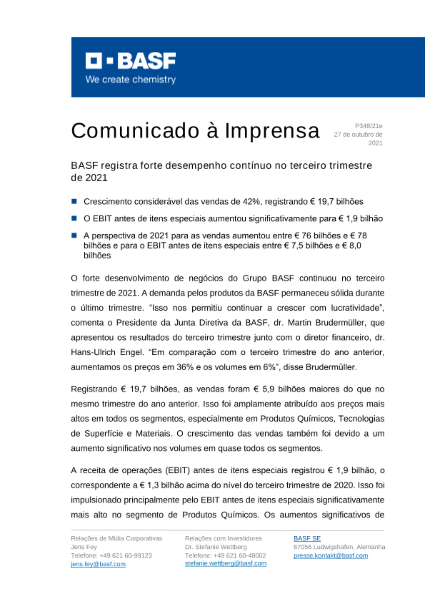 O forte desenvolvimento de negócios do Grupo BASF continuou no terceiro trimestre de 2021. A demanda pelos produtos da BASF permaneceu sólida durante o último trimestre. “Isso nos permitiu continuar a crescer com lucratividade”, comenta o Presidente da Junta Diretiva da BASF, dr. Martin Brudermüller, que apresentou os resultados do terceiro trimestre junto com o diretor financeiro, dr. Hans-Ulrich Engel. “Em comparação com o terceiro trimestre do ano anterior, aumentamos os preços em 36% e os volumes em 6%”, disse Brudermüller.