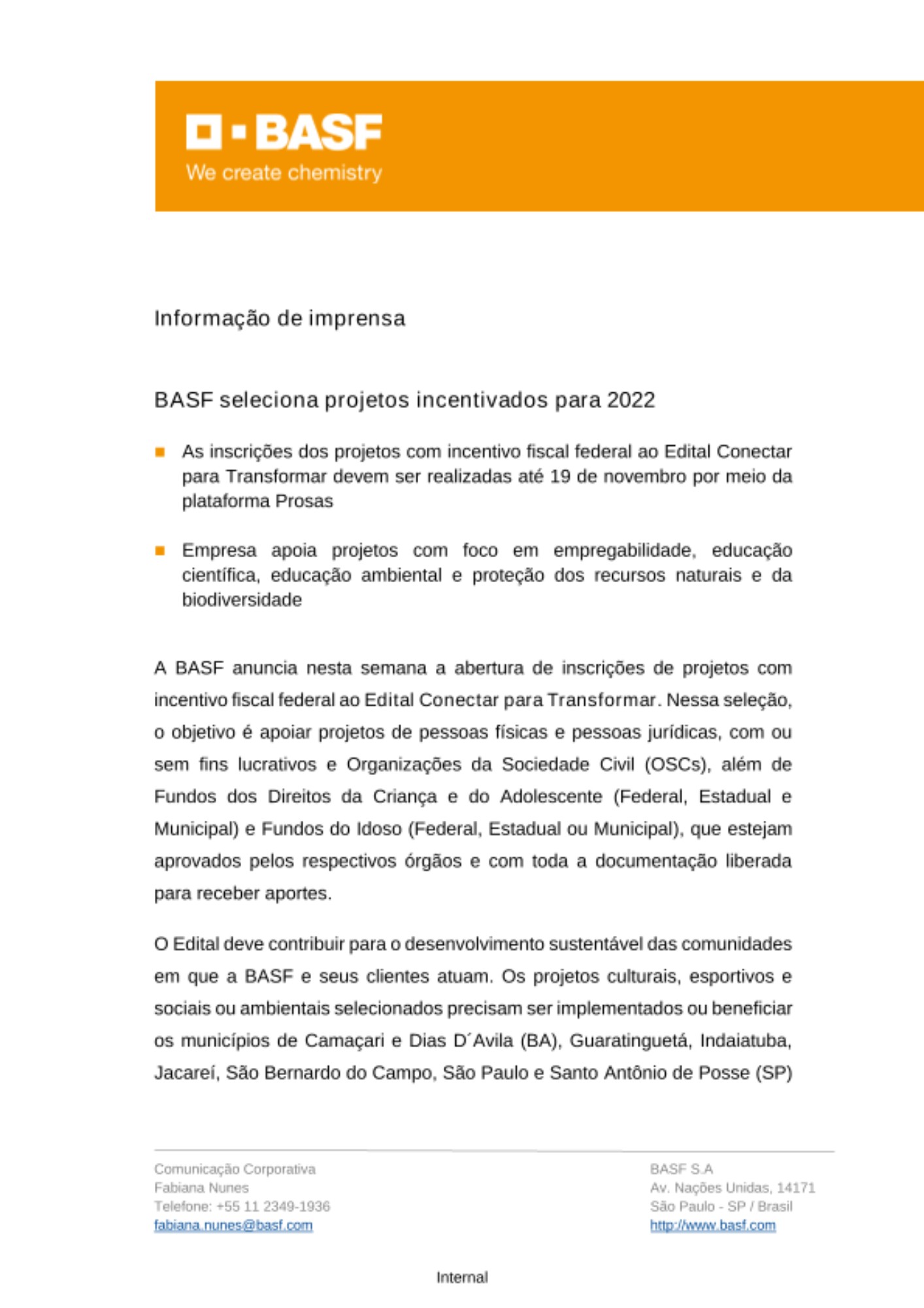 “A BASF conta com uma longa história de compromisso social e ambiental e entendemos que nossa atuação é ainda mais importante no contexto atual. Nossa estratégia de engajamento social prevê ampliar o impacto positivo da empresa ao conectar a resolução de desafios sociais à estratégia de negócios. O Edital Conectar para Transformar é uma ferramenta utilizada pela empresa para selecionar anualmente projetos que serão implementados com recursos próprios da empresa. Esta é a segunda vez que a empresa utiliza um chamamento público também para projetos incentivados, permitindo que um número maior de proponentes e empreendedores que têm iniciativas em sinergia com nossos objetivos, possam ter suas propostas analisadas”, explica Ivânia Palmeira, consultora de sustentabilidade da BASF.