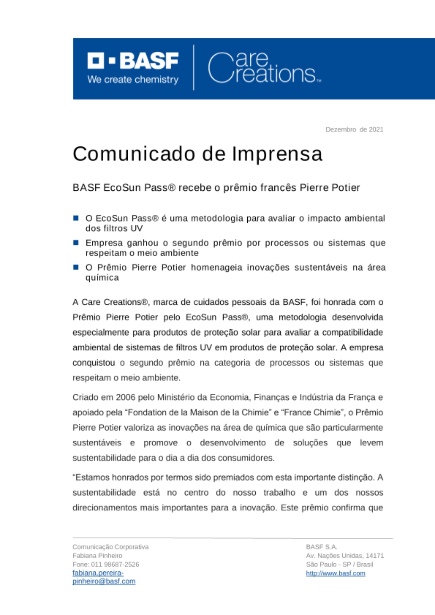 A Care Creations®, marca de cuidados pessoais da BASF, foi honrada com o Prêmio Pierre Potier pelo EcoSun Pass®, uma metodologia desenvolvida especialmente para produtos de proteção solar para avaliar a compatibilidade ambiental de sistemas de filtros UV em produtos de proteção solar. A empresa conquistou o segundo prêmio na categoria de processos ou sistemas que respeitam o meio ambiente.