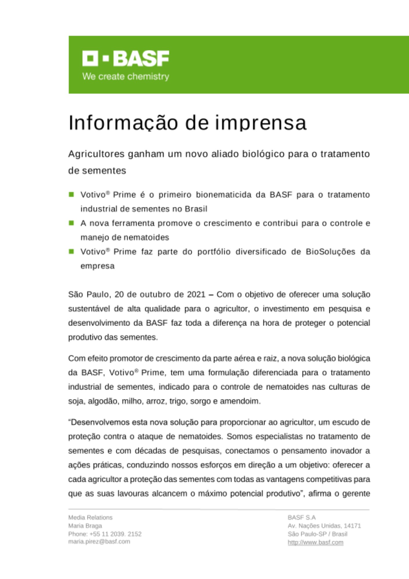 • Votivo® Prime é o primeiro bionematicida da BASF para o tratamento industrial de sementes no Brasil